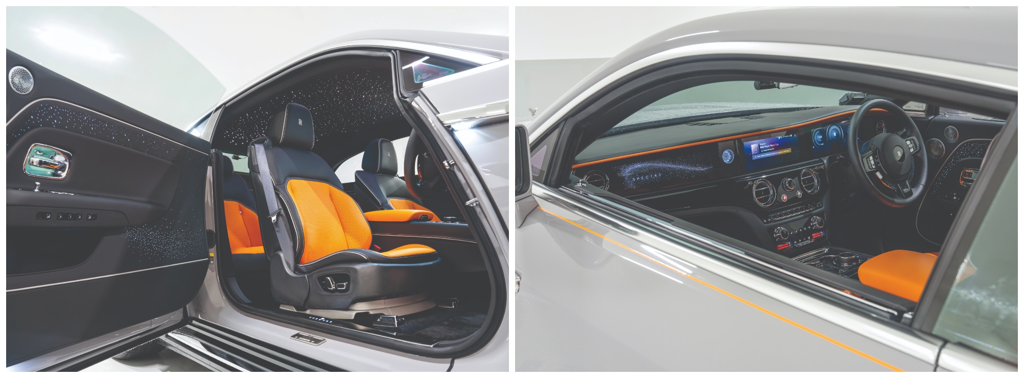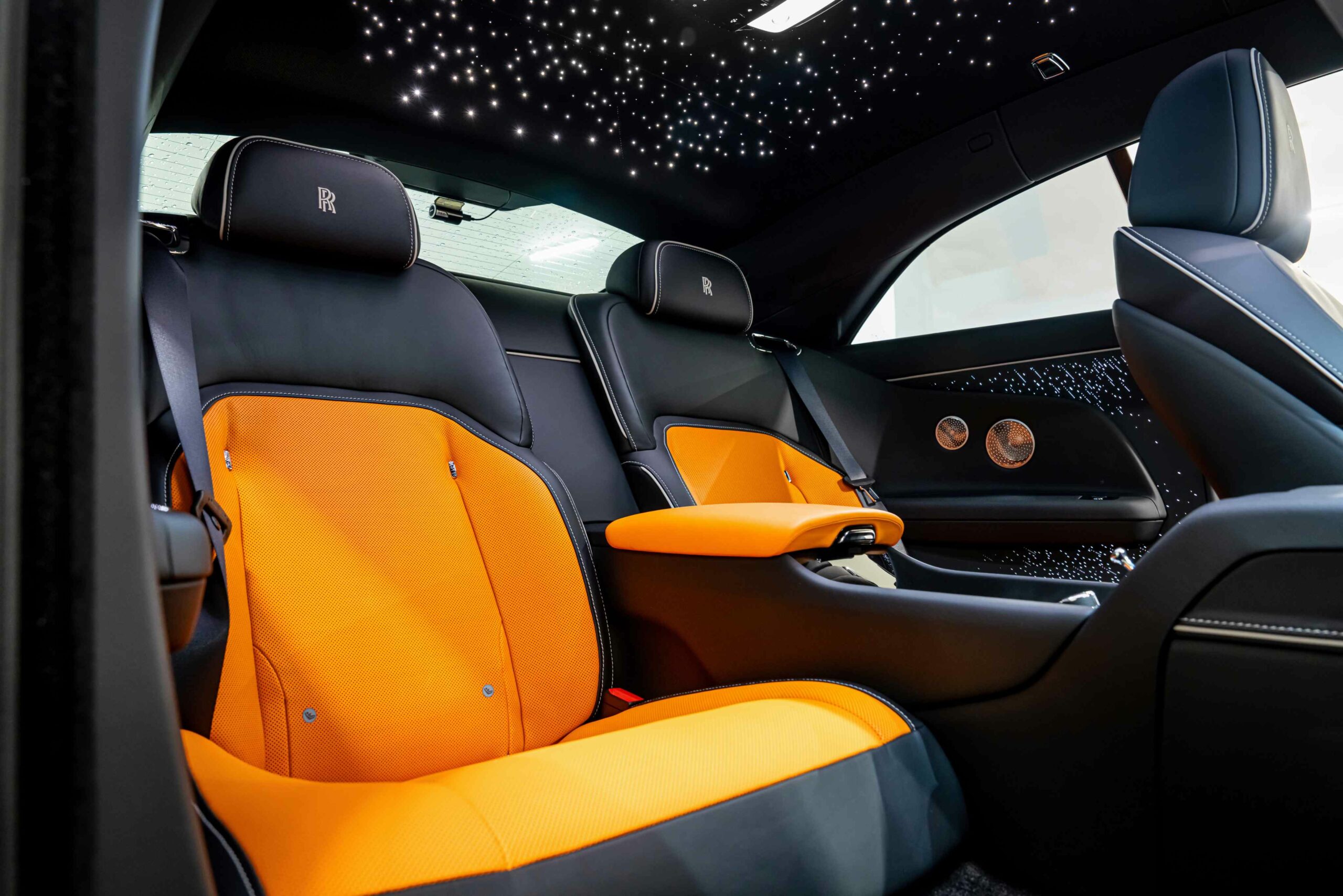 Bên trong chiếc xe hai cửa sang trọng này, hai hàng ghế trong cabin được bọc vải xô, mang đến sự thoải mái tuyệt vời cho bốn người ngồi. Mặc dù Rolls-Royce đã giới thiệu nhiều chi tiết thiết kế dành riêng cho Spectre, nhưng thiết kế nội thất phần lớn lại mang phong cách xa hoa, trông giống như thư viện ốp gỗ nằm bên trong một ngôi nhà nguy nga. Chẳng hạn, các tấm cửa của Spectre mang đến ánh sáng lấp lánh tương tự như trần xe đầy sao mang tính biểu tượng của thương hiệu, với dàn đèn LED li ti lấp lánh gần tay vịn. Hơn nữa, vì là “con cưng” của Rolls-Royce nên Spectre cũng đi kèm với vô số vật liệu và khả năng cá nhân hóa vô tận.