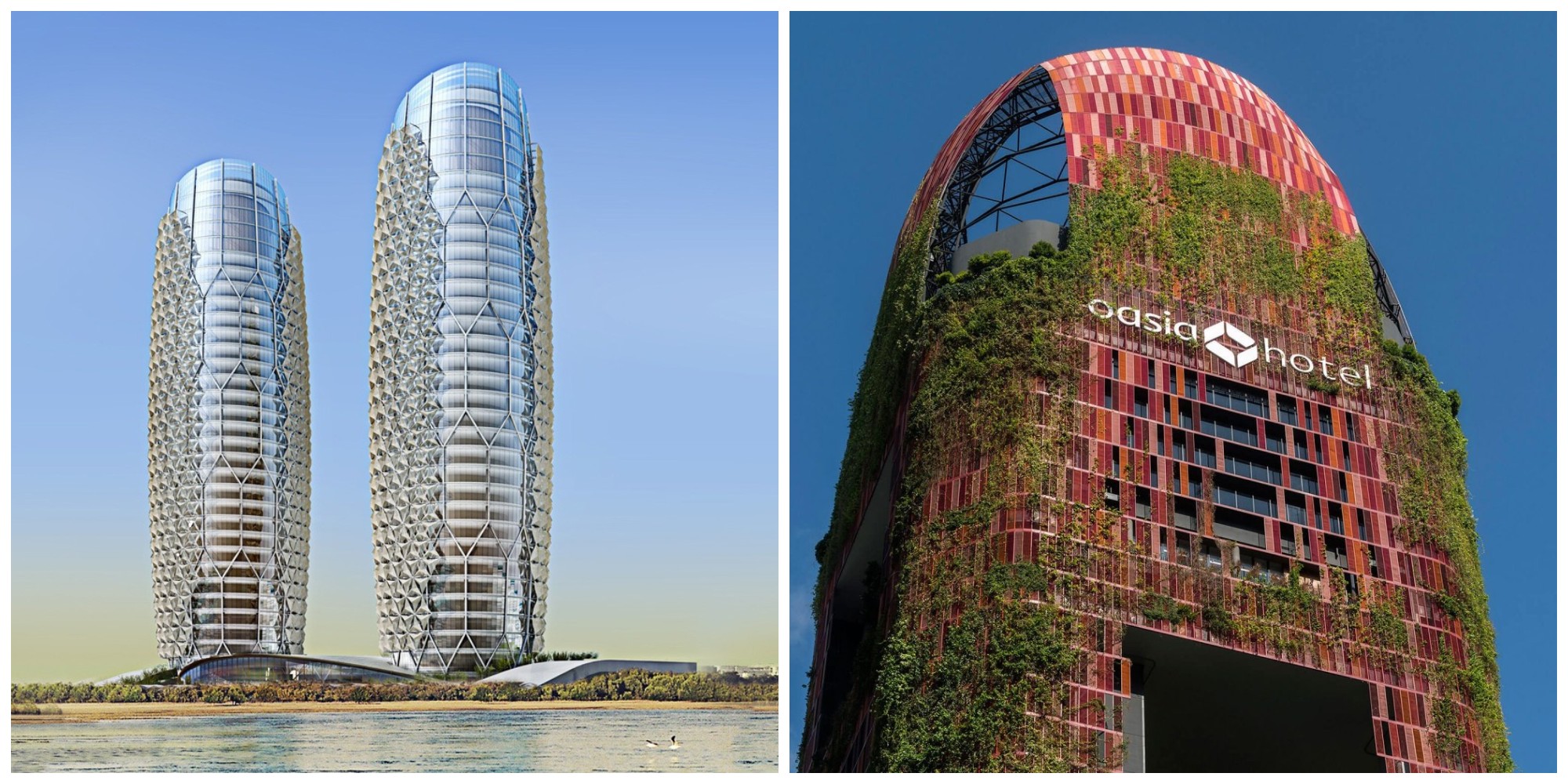 Oasia Downtown là một tòa tháp xanh 27 tầng sừng sững ngay trung tâm đảo quốc sư tử biển. Khách sạn này tích hợp các không gian xanh vào trong kiến trúc nhằm cải thiện chất lượng không khí đô thị. Tương tự như Bosco Verticale, công trình này là một khu vườn dọc với hơn 21 loài cây leo, giúp hấp thụ CO2, sản xuất oxy và tăng cường chất lượng không khí xung quanh. Bên trong tòa nhà, thông gió tự nhiên và không gian xanh được ưu tiên, nâng cao hiệu quả năng lượng. Toàn bộ công trình chính là một ví dụ về cách thiết kế sinh học có thể biến đổi không gian đô thị thành những môi trường lành mạnh, bền vững hơn.