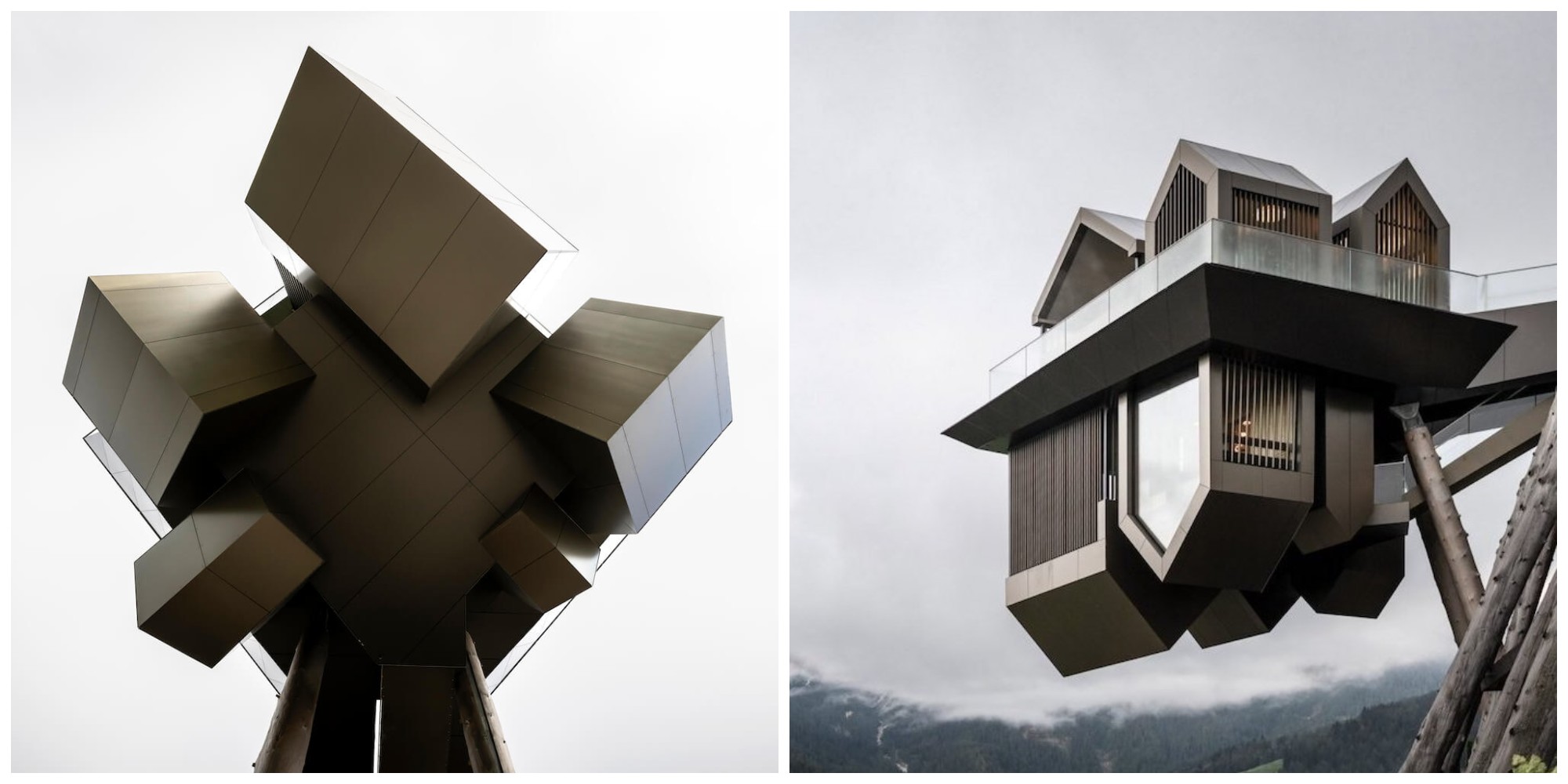 Network of Architecture đã tham khảo sự phản xạ trong nước khi tạo Hub of Huts – một khu vực an sinh dường như bất chấp trọng lực tại khách sạn Hubertus ở Nam Tyrol. Được hỗ trợ bởi các cây cột lớn, cấu trúc kỳ lạ này nằm ngay phía trên một hồ bơi có đáy bằng kính mà studio Ý đã tạo ra năm 2016, mang đến trải nghiệm bơi lội cực kỳ thú vị cho du khách.