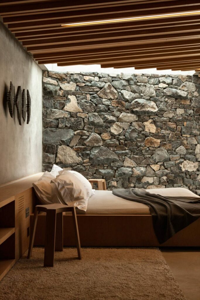 Không có ranh giới rõ ràng giữa phòng khách, khu bếp và không gian ngủ. Mọi thứ được gắn kết mượt mà để người ở cảm nhận trọn vẹn từng khoảnh khắc của biển và trời, sáng hướng ra đại dương, đêm thu mình trong cảm giác êm ấm giữa đá và gỗ.