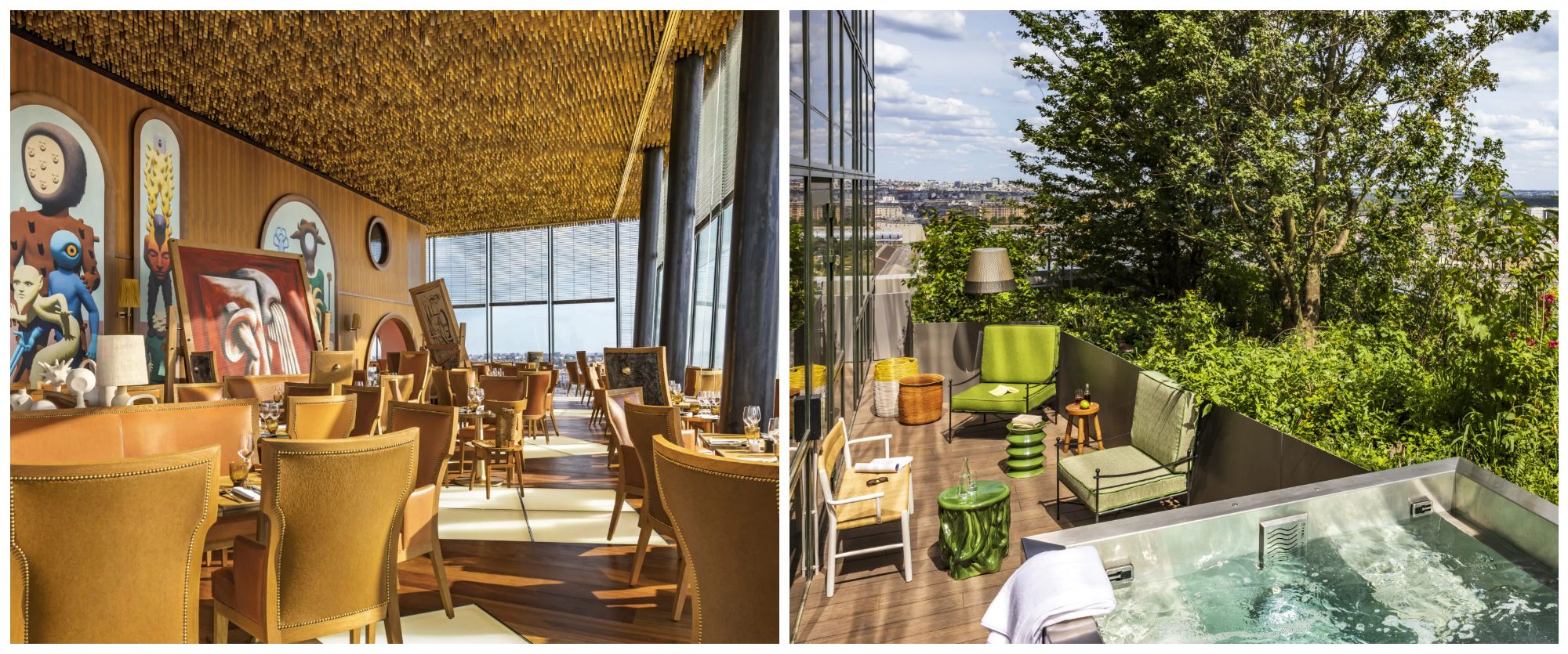 Nằm trong khối lập phương bằng kính có trần vàng lấp lánh, TOO Restaurant là điểm nhấn nổi bật của khách sạn, hoàn chỉnh với hệ thống cửa sổ kính kịch trần 6m, thu hút thực khách bởi những bức tranh treo tường kì dị, chương trình biểu kĩ nghệ phong cách Paris và thực đơn lấy cảm hứng từ châu Á với các món ăn sáng tạo. Tiếp đến, TOO Chill spa không khác gì thiên đường xua tan bao muộn phiền với phòng xông hơi khô bằng gỗ tuyết tùng đặt làm riêng và bể sục ngoài trời nằm trên sân hiên tầng 17 rợp bóng cây nhìn ra sông Seine.