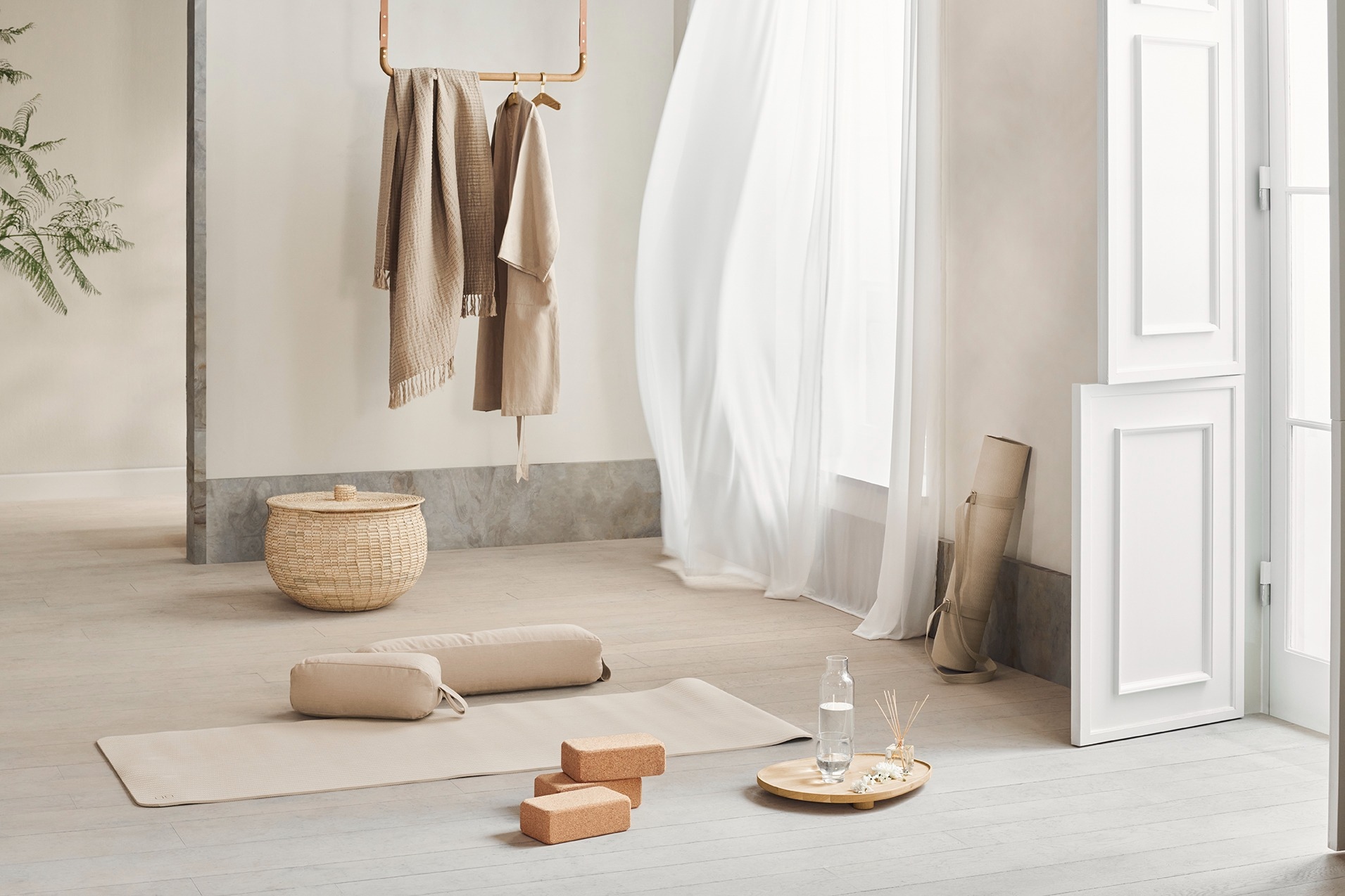 Cuối cùng, Bolia còn chăm chút cho các dụng cụ tập yoga Lenya nâng cao sức khỏe được làm từ nút chai, da hoặc xốp sản xuất bởi 30% polyetylen tái chế.