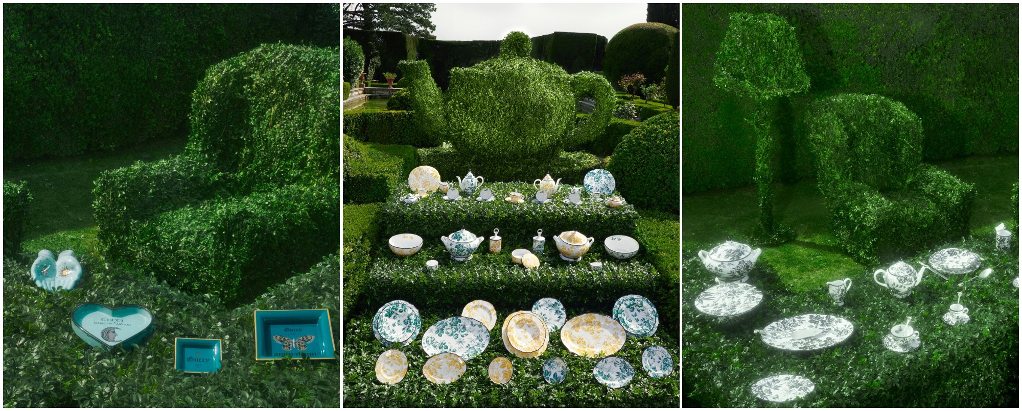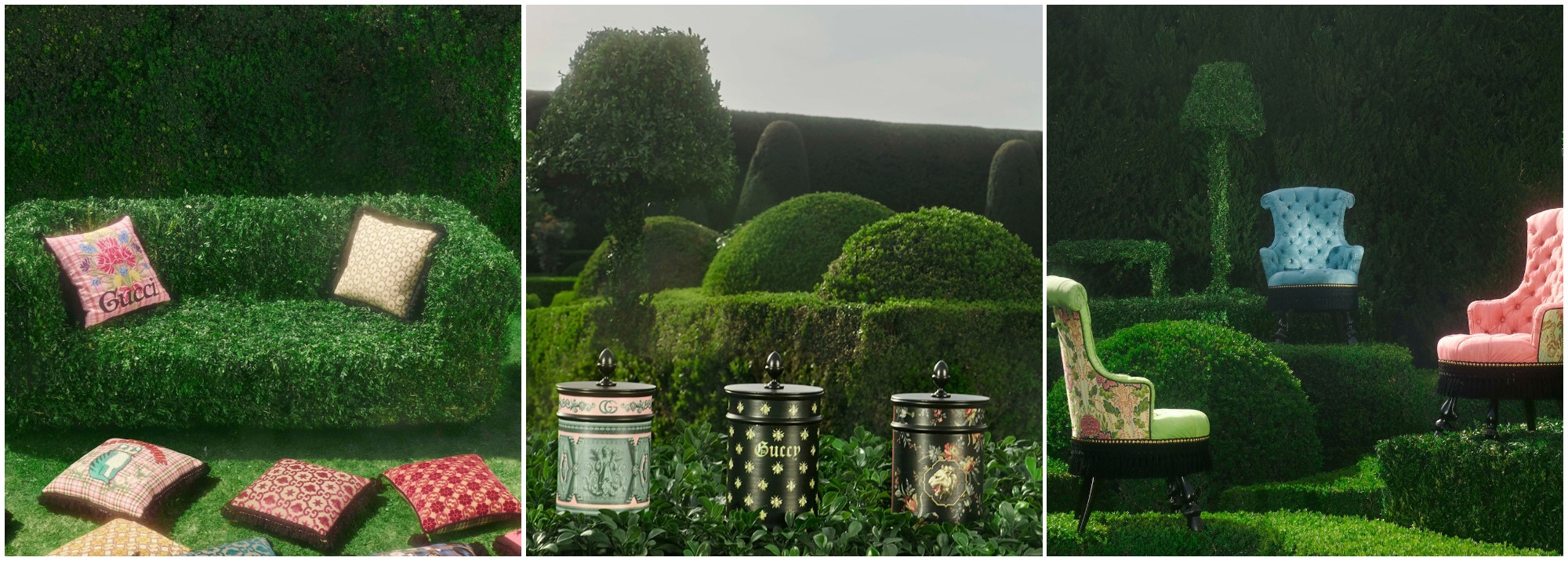 Chiến dịch tại nhà của Giám đốc Sáng tạo Alessandro Michele dựa trên nguồn cảm hứng sâu sắc về thiên nhiên và hệ động thực vật đa dạng. Những chiếc ghế sofa và gối mang kiểu dáng hoàn hảo và được phủ lên màu sắc rực rỡ, trong khi bộ nến thơm bốn mùi hương cũng như khay đựng trang sức sở hữu thiết kế tinh tế hài hoà.
