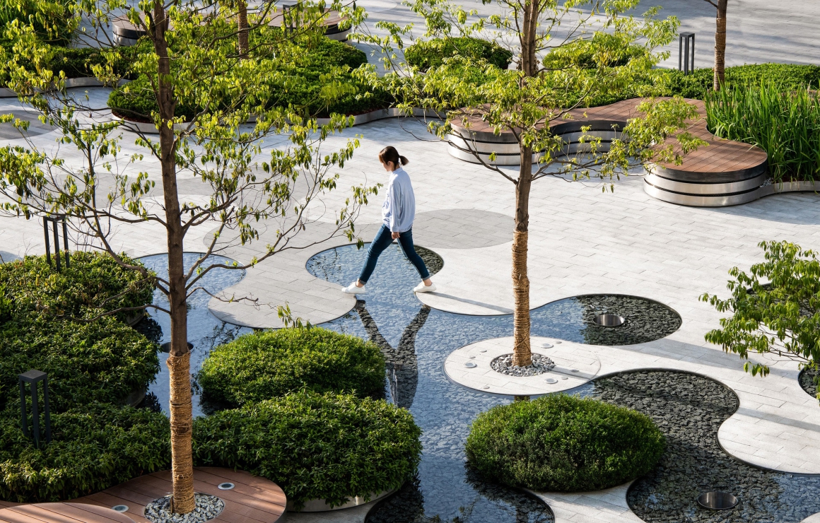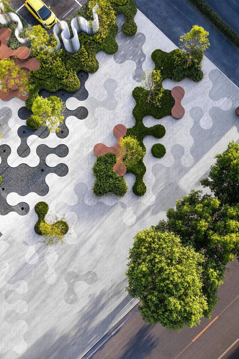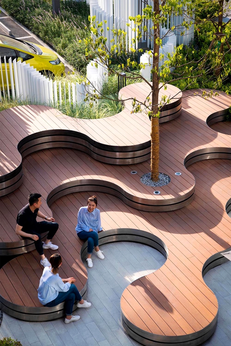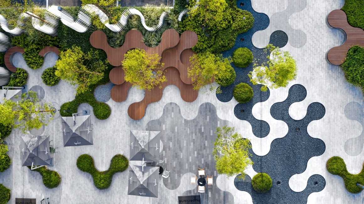 Bao quanh phía Đông Bắc của dự án là một bức màn được làm từ dải màu trắng với chuyển động quanh co, kết nối toàn bộ không gian. Nhờ vậy, bạn có thể tận hưởng không gian riêng tư tĩnh lặng nhưng vẫn thả hồn mơ mộng vào chuyển động uyển chuyển từ những bức màn. Thiết kế cảnh quan của dự án được thiết lập dựa trên nguyên tắc tạo ra một hệ thống cân bằng, đáp ứng cả nhu cầu nhân văn lẫn môi trường. Một loạt các mạng lưới hướng tới cộng đồng đã được đưa vào dự án như không gian xã hội, không gian biểu diễn nghệ thuật sáng tạo, hệ thống trồng cây…