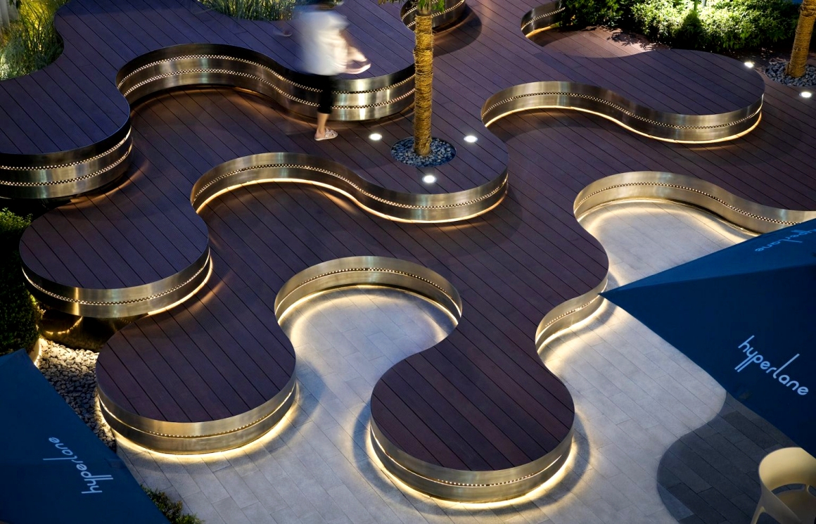 Lối đi bộ của Hyperlane kết nối ga tàu nhanh Thành Đô với trường đại học, đồng thời cho phép kết nối trực tiếp từ chỗ ở của sinh viên tới khuôn viên trường đại học. Lối đi được bố trí những chỗ ngồi bậc thang với cạnh cong. Đây chắc chắn là một nơi hoàn hảo để thư giãn dưới những tán cây xanh rờn và khung cảnh bình yên xung quanh. Vào buổi tối, những chiếc ghế xếp tầng này còn có đèn chiếu sáng để làm nổi bật lên phần đường cong độc đáo.