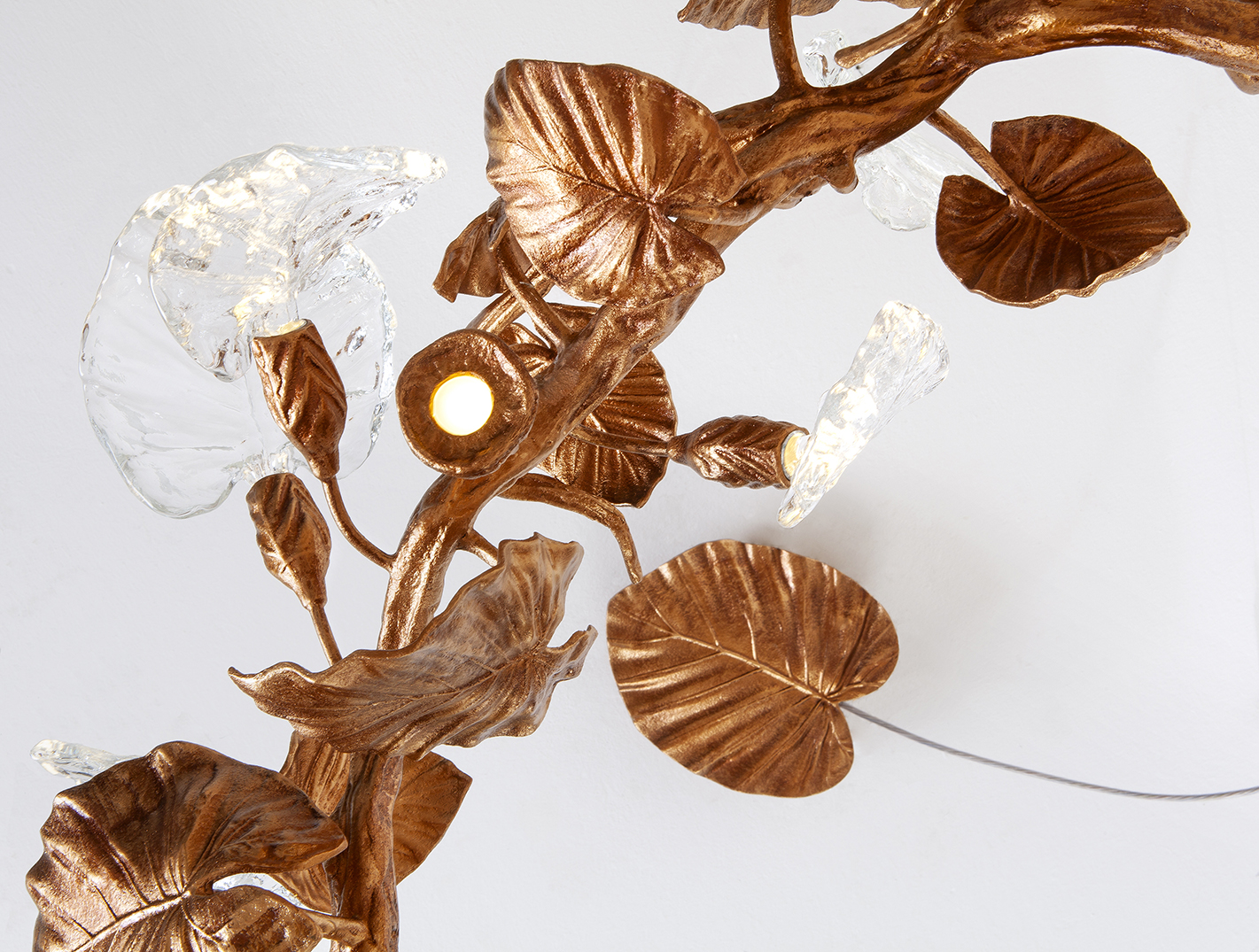 Mềm mại, sang trọng và gợi cảm; những thiết kế trong bộ sưu tập Calathea tưởng chừng như riêng biệt thế nhưng lại liên kết với nhau một cách hết sức tự nhiên; thể hiện sự hài hòa tuyệt vời giữa các yếu tố sống động và sang trọng, xa hoa và mộc mạc, hay cao hơn là đất và trời. Câu chuyện của Calathea vượt xa giới hạn của một món đồ trang trí đắt tiền mà ẩn chứa những ý nghĩa sâu sắc hơn về sự kết nối với Trái đất, nguồn gốc sự sống qua trăm triệu năm và cách mà ánh sáng dẫn dắt chúng ta đến với trạng thái cân bằng cả trong thân thể lẫn tâm trí. Tất cả những điều huyền diệu ấy chẳng thể đến từ một quy trình sản xuất máy móc vô cảm mà đòi hỏi quá trình sáng tạo, nghiên cứu đầy kỳ công; cũng như cách mà những người nghệ nhân chế tác đã đặt toàn bộ trái tim kính ngưỡng thiên nhiên vào từng giai đoạn thực hiện.