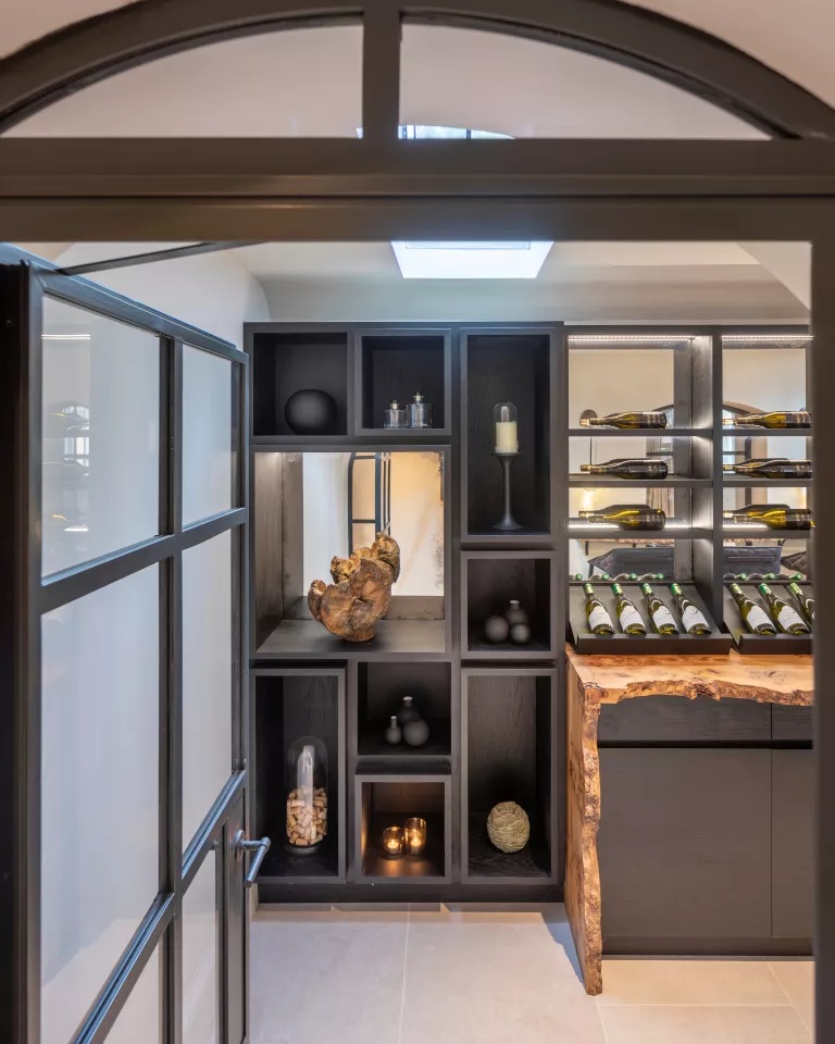 Sử dụng màu tro đen bóng bẩy, phòng rượu ấn tượng giờ đây liên kết với nhà bếp. Cả không gian được nâng tầm với cửa ra vào và cửa sổ Crittall, tủ lạnh Gnticnau, hệ thống chiếu sáng tự động và các chi tiết gỗ hữu cơ độc đáo. Butler cho biết thêm: “Những gia chủ rất thích rượu và các hoạt động giải trí với gia đình cũng như bạn bè. Ý tưởng đằng sau quầy bar waney edge là để có thể nếm thử rượu vang và pho mát – đó là một nơi tuyệt vời để ngồi.”