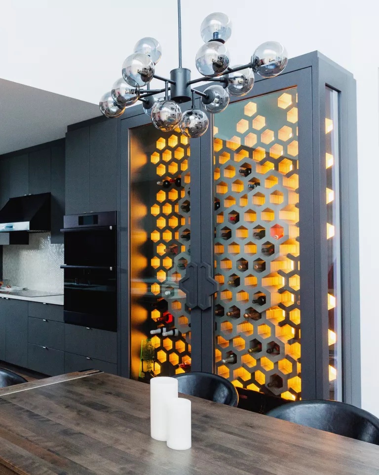 Một chiếc tủ rượu có khả năng kiểm soát nhiệt độ sẽ là “ngôi sao sáng” giữa căn bếp nhà bạn – như cách mà một gia đình ở Québec đã thiết kế. Lấy cảm hứng từ hình dạng của tổ ong, các kệ rượu được đặt làm riêng theo công nghệ cắt laser sao cho chúng thẳng hàng hoàn hảo và có độ sâu phù hợp để giữ chắc những chai rượu. Tủ rượu này cũng sở hữu bảng điều khiển nhiệt độ để gia chủ tùy chỉnh sao cho thích hợp với loại rượu mình đang bảo quản. Đặc biệt, mặt kính mờ còn được trang bị hệ thống điều chỉnh ánh sáng để chuyển đổi sang 14 màu khác nhau tùy theo sở thích hoặc tâm trạng của chủ nhân.