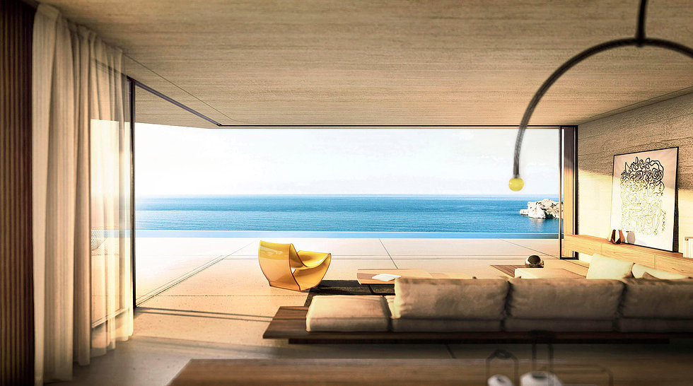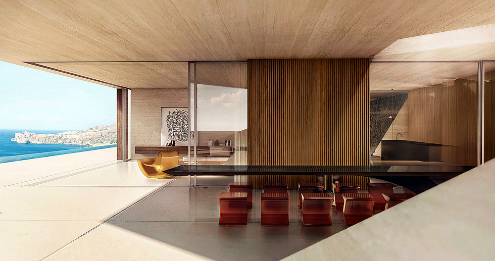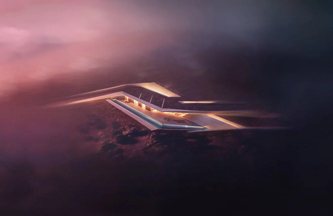 ội ngũ kiến trúc sư đã tích hợp hoàn toàn dinh thự vào cảnh quan thiên nhiên bằng cách đặt phần đế của dinh thự nằm trong lòng đất để giữ lại trọn vẹn vẻ đẹp hoang sơ cho vùng đất. Chuyển động và độ sắc nét của kiểu cổ cong này có hình dạng như một lưỡi dao bê tông liên tục phân định ranh giới của nơi cư trú và cung cấp một cái nhìn rộng hơn theo hai hướng cơ bản.