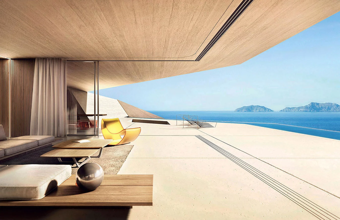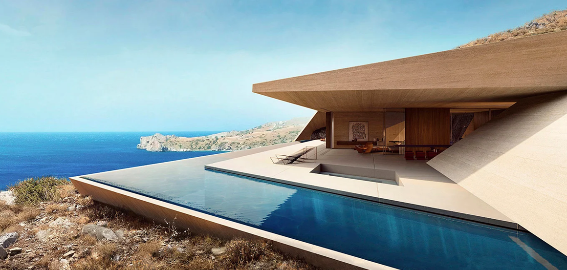 Để gợi ra những vết cắt vừa sắc nét, điêu luyện vừa nhẹ nhàng, tinh tế của thanh kiếm Katana, công trình kiến trúc đã được các nghệ nhân dày công điêu khắc ngay trên mảnh đất Cretan. Hiệu ứng thị giác chuyển động cùng độ sắc nét đến tinh xảo của những nét khắc khiến tòa nhà tựa như một lưỡi kiếm có hình dạng quanh co tô điểm cho thiên nhiên hùng vĩ, tạo nên một khung cảnh đẹp đến nao lòng. Khi nhìn từ trên cao xuống, ranh giới giữa dinh thự và cảnh quan xung quanh dường như bị xóa nhòa, kiến trúc và thiên nhiên hòa làm một để tạo nên một tuyệt tác nghệ thuật ngàn năm có một.
