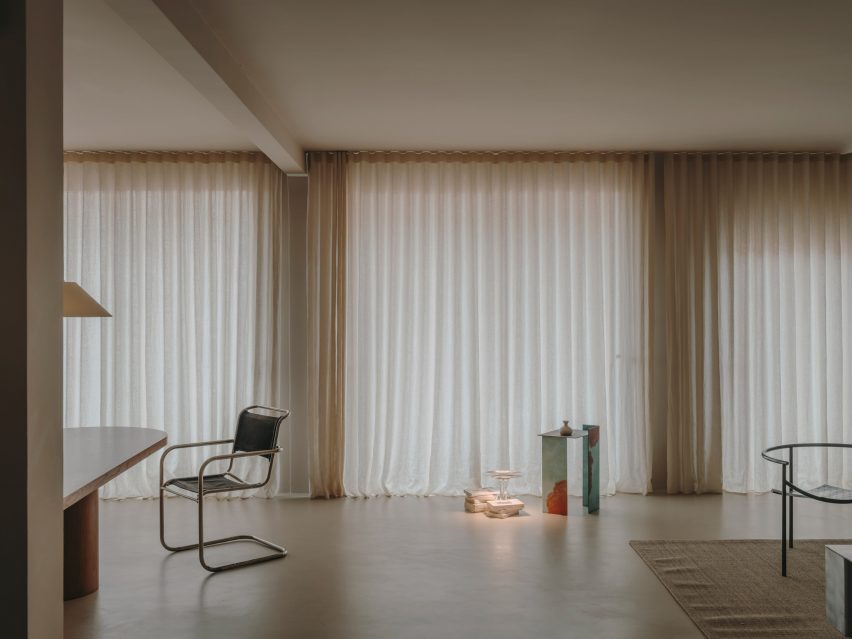Serra ví căn hộ như một “mảng màu tĩnh lặng” để làm nổi bật nội dung bên trong: từ ghế Dr. Sonderbar của Philippe Starck, đèn Lotek của Benno Premsela đến bàn cà phê kim loại góc cạnh của Paul Coenen, tất cả cùng kể nên câu chuyện về sự giao thoa giữa nghệ thuật, thiết kế công nghiệp và thủ công truyền thống.