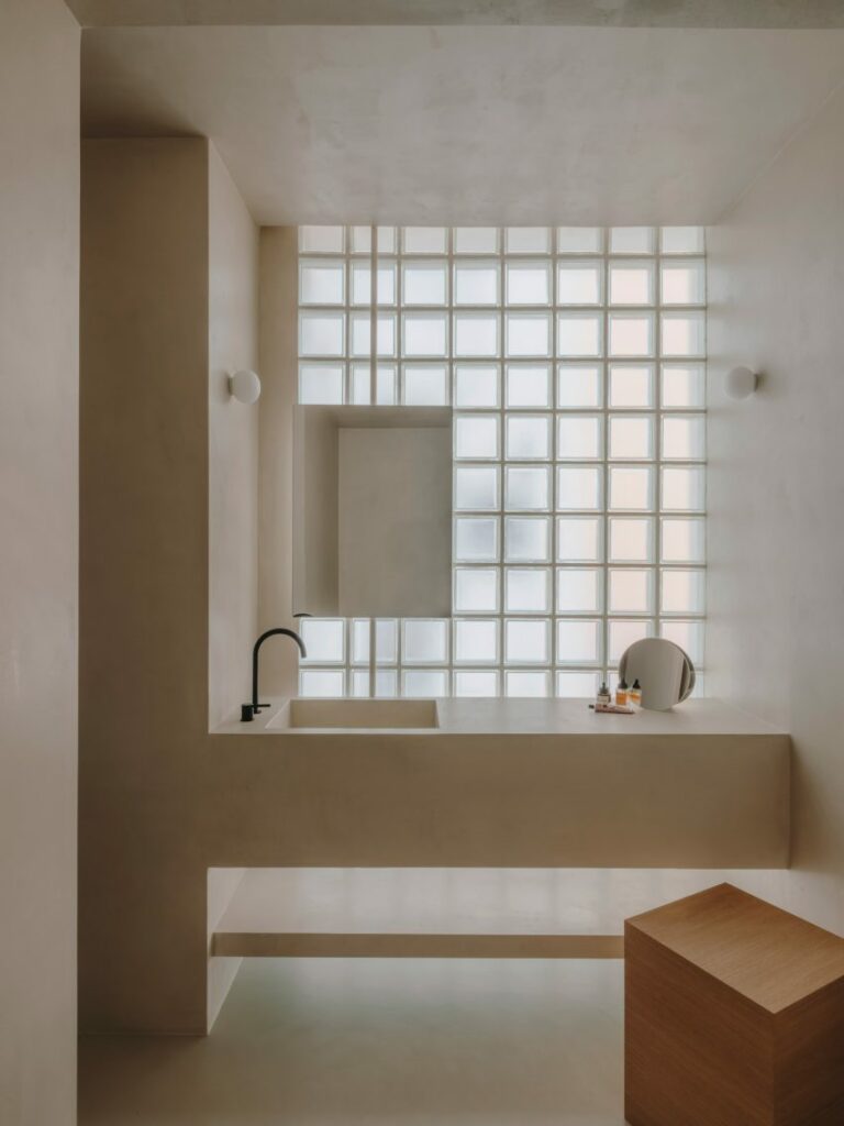 Bức tường gạch kính dẫn ánh sáng tự nhiên vào phòng tắm chính.