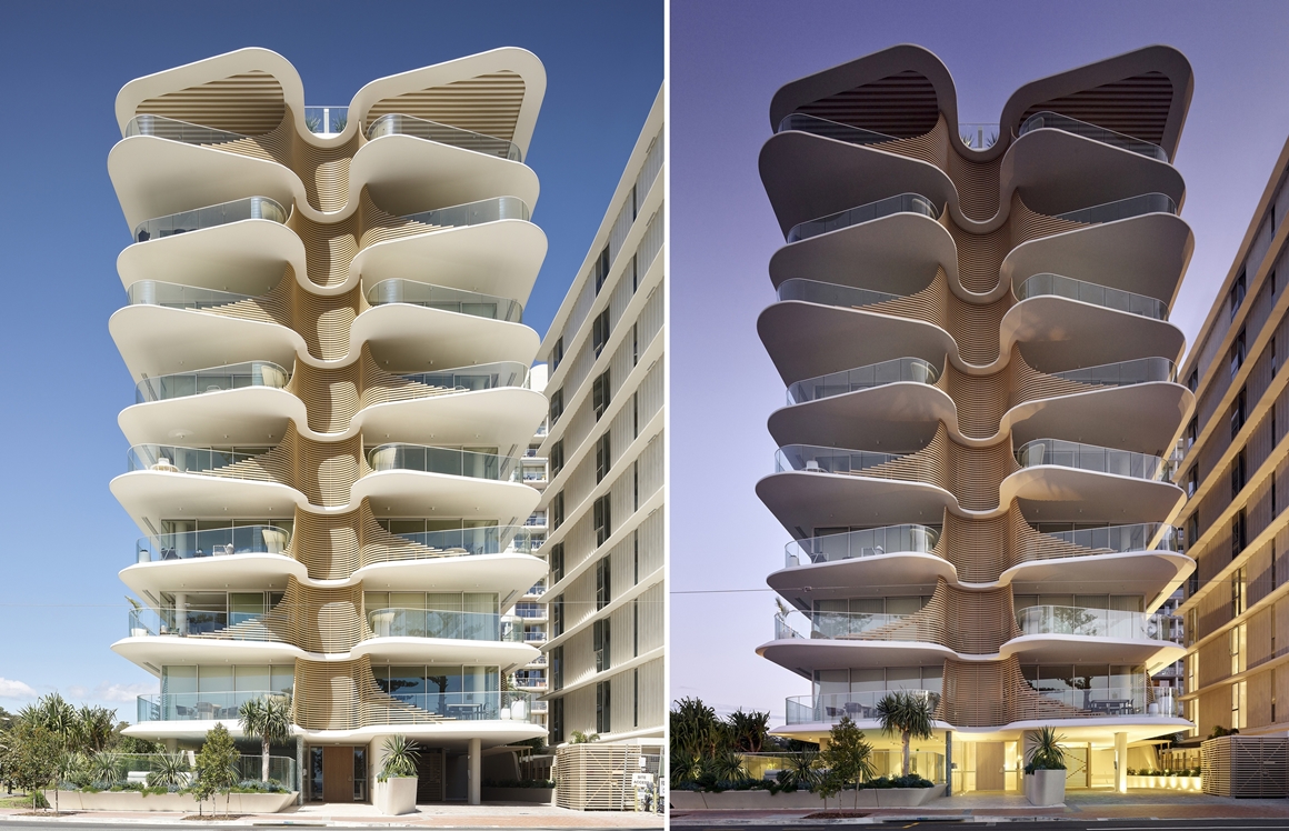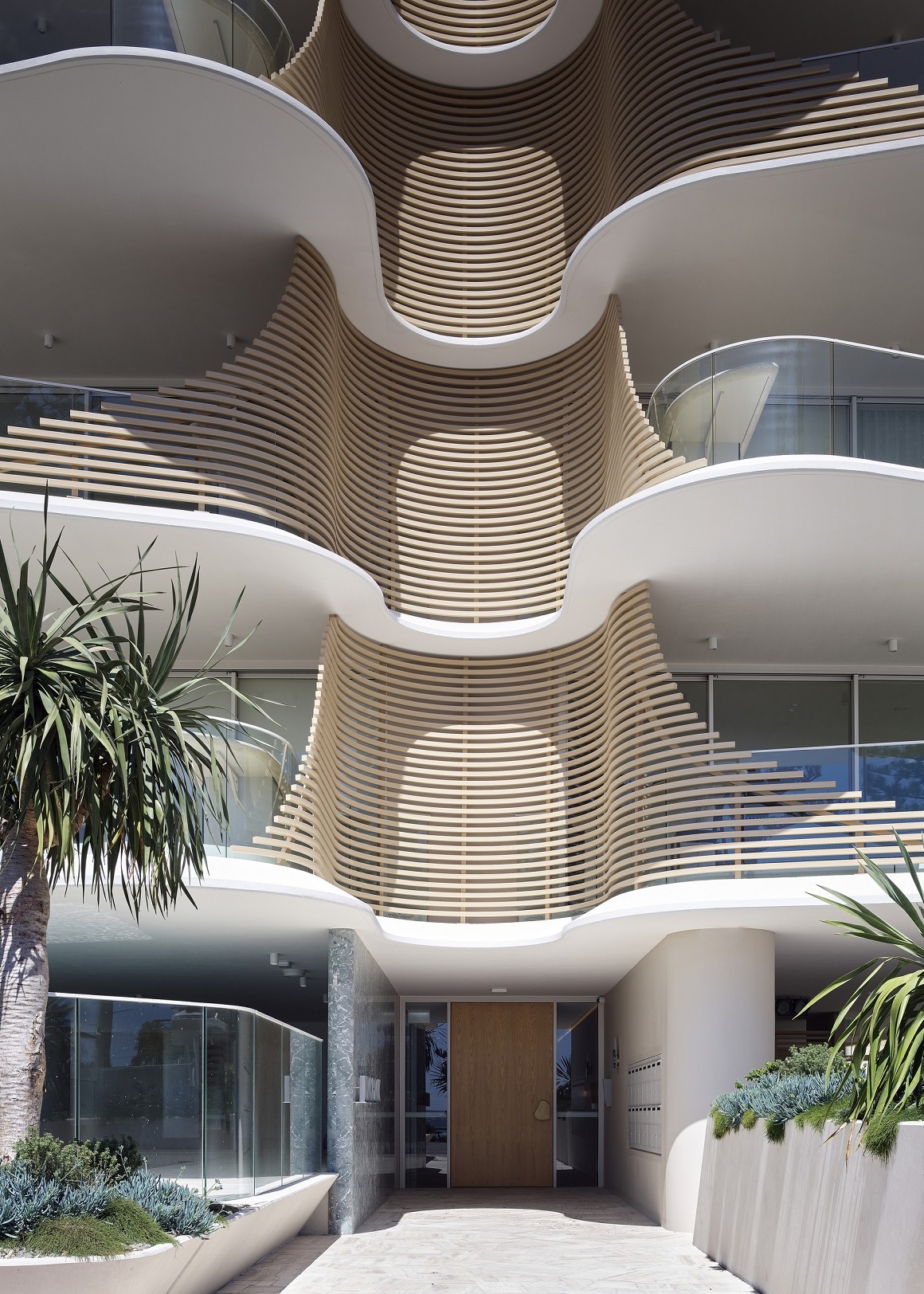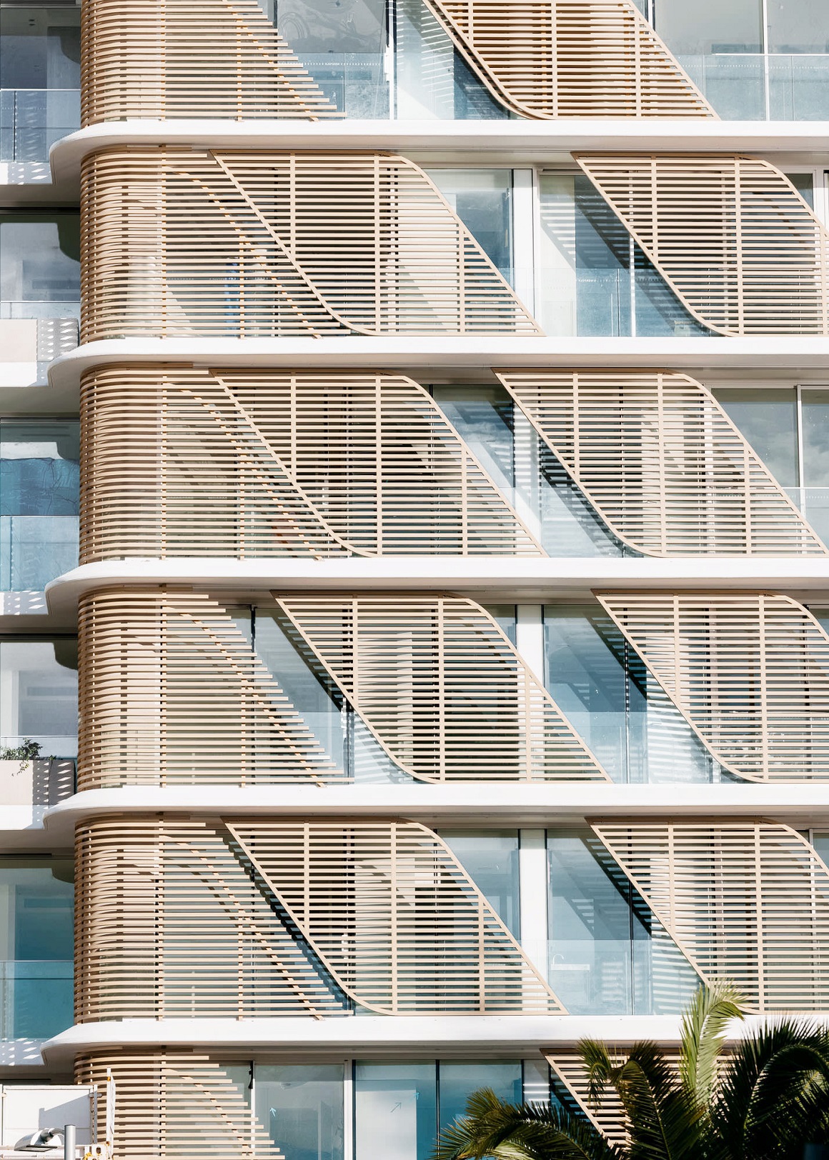 Các tấm ban công nổi của tòa nhà được chồng lên nhau một cách có tổ chức nhằm cung cấp bóng râm cho không gian bên dưới, kèm theo hệ thống sàng lọc dạng trượt có thể điều khiển được để giữ gìn sự riêng tư và bảo vệ cư dân khỏi các tác động ngoài trời. Những tấm chắn bằng gỗ trượt đem đến sự linh hoạt cũng như tạo ra không gian mở cho một trải nghiệm sống bên bờ biển có một không hai cho mỗi căn hộ.