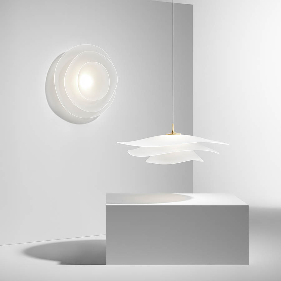 Có sẵn dưới dạng cả đèn tường và đèn trần với hai kích cỡ, đèn Capeline có ba hào quang nhấp nhô bằng thủy tinh mờ lấy cảm hứng từ mũ rộng vành của phụ nữ, khuếch tán ánh sáng năng động thông qua đèn LED có thể điều chỉnh độ sáng.