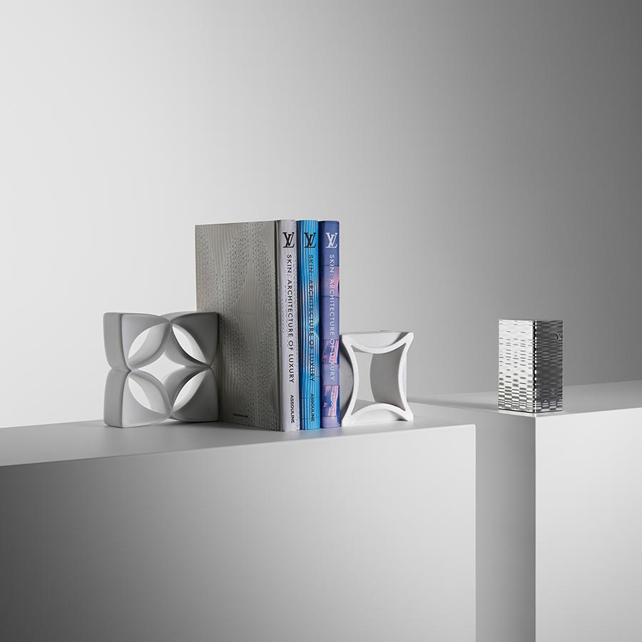 Mang đến sự linh hoạt và tính nghệ thuật, những chiếc bookend này có ba thiết kế – Hoa và Kim cương bằng đá cẩm thạch nguyên khối lấy cảm hứng từ mẫu Monogram mang tính biểu tượng và Namiki, một bản sao bằng nhôm được chải và đánh bóng hình dáng của một tòa nhà đặc biệt ở Tokyo do Jun Aoki thiết kế. Những giá sách này xác định lại không gian cho những người yêu sách cũng như những người đam mê thiết kế.