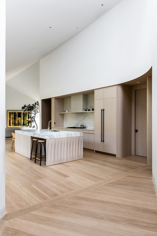 Sàn nhà và các tủ bếp được làm từ gỗ sồi trắng, mang tới sự ấm áp nhưng cũng không kém phần trang nhã. Sử dụng nội thất có sự pha trộn giữa các mảng màu sáng tối đầy tinh xảo, nhà bếp là sự kết hợp của tủ gỗ tối giản với tay cầm màu đen và mặt bếp được làm từ đá cẩm thạch sáng màu.