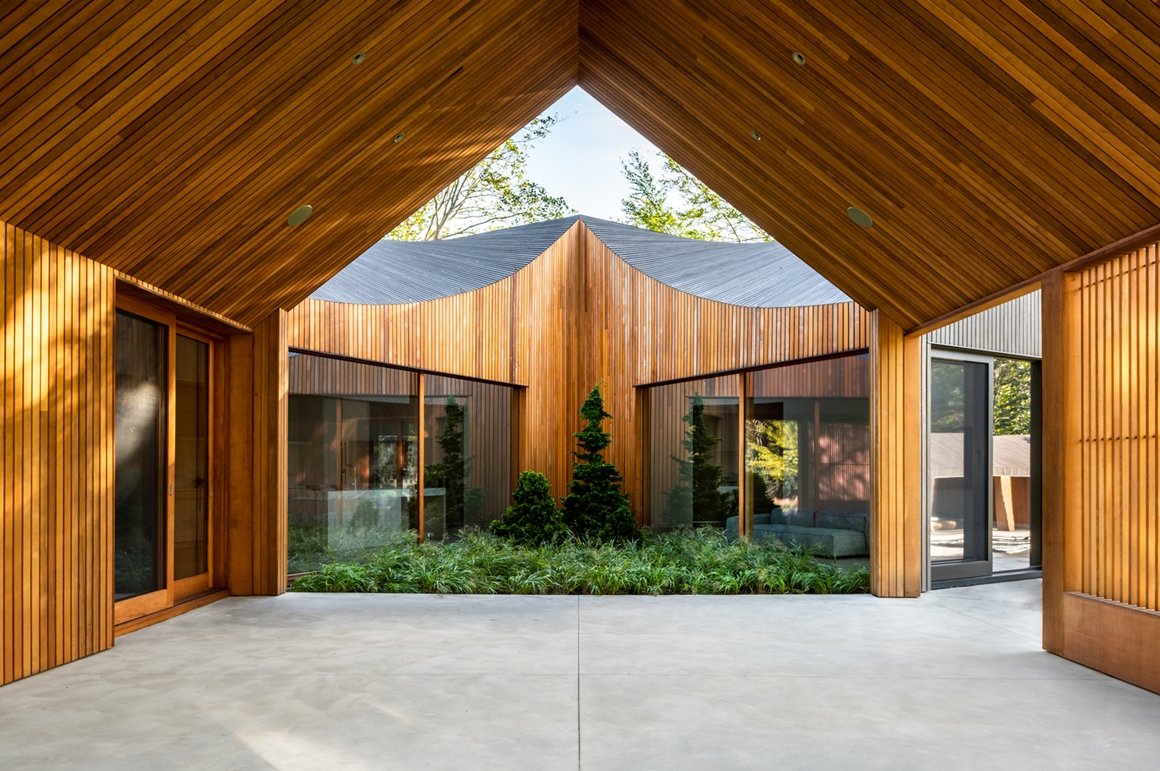 Mỗi một mô-đun đều có đầu hồi được sắp xếp và căn chỉnh đường gờ mái để tạo nên sự kết nối với nhau. Nhờ thiết kế đường cong như dòng nước chảy, mái hiên của các mô-đun đem tới hiệu ứng nhấp nhô nhưng vẫn liên kết rất hợp lý. Khác với bên ngoài, các khu vực trong nhà như sân vườn hình tam giác và hiên nhà đều được bao phủ bởi gỗ tuyết tùng màu vàng.