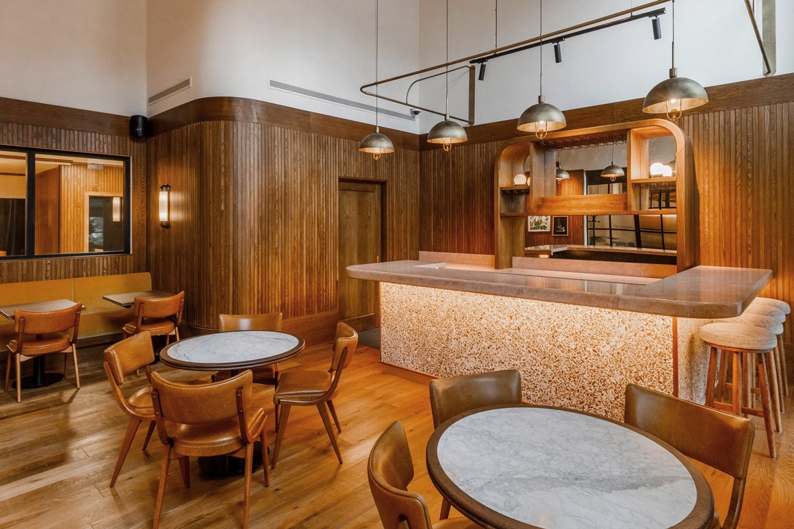 Từ sảnh chờ rộng rãi ấy, cư dân có thể dễ dàng di chuyển sang quán ăn gần đó để thưởng thức món ăn hoặc đồ uống yêu thích của mình. Tường xung quanh không gian này được ốp gỗ, bên cạnh đó là nhiều ghế bọc da thuộc sang trọng cùng điểm nhấn đặc biệt là quầy phục vụ ốp đá terrazzo màu cam.