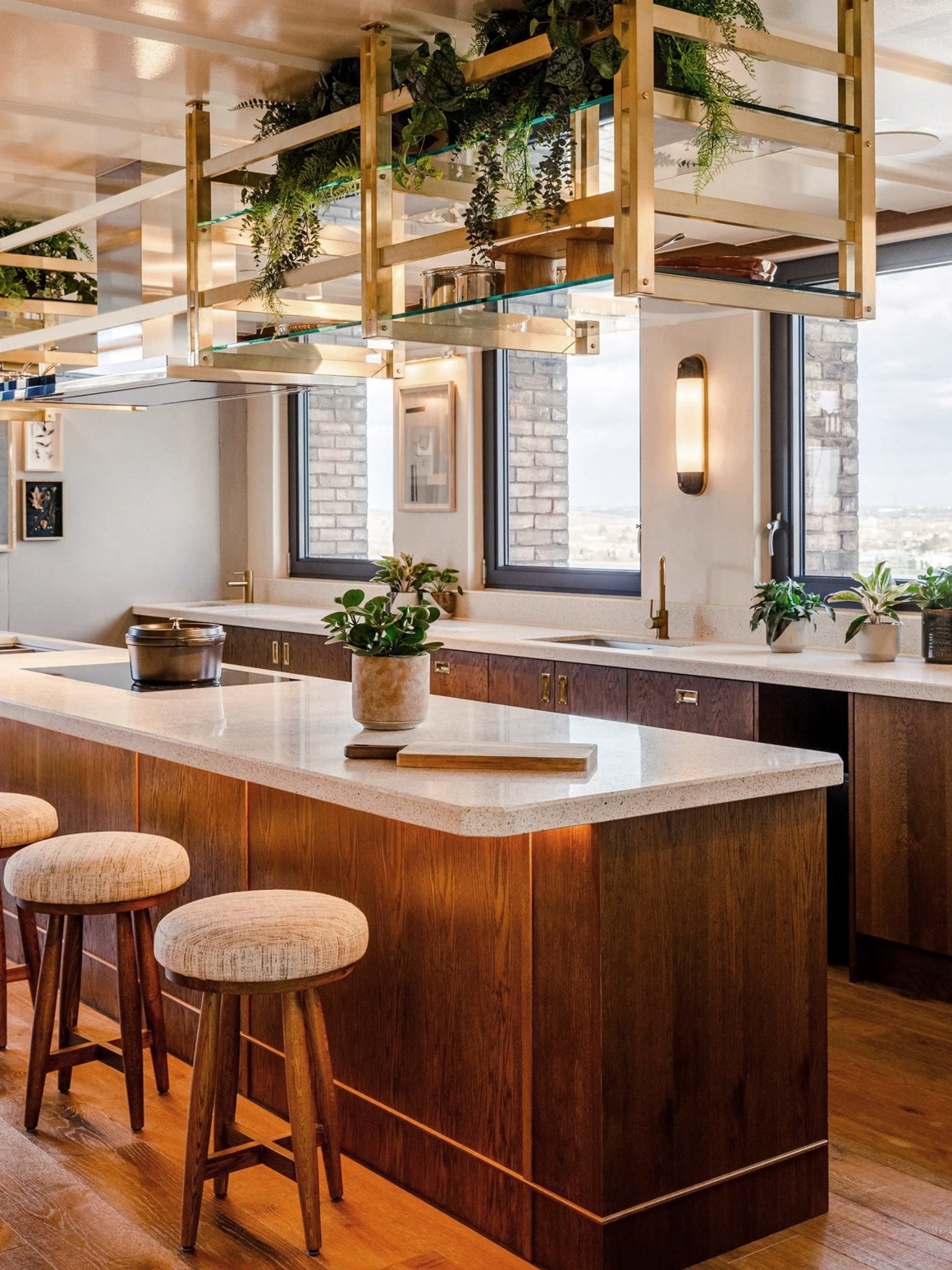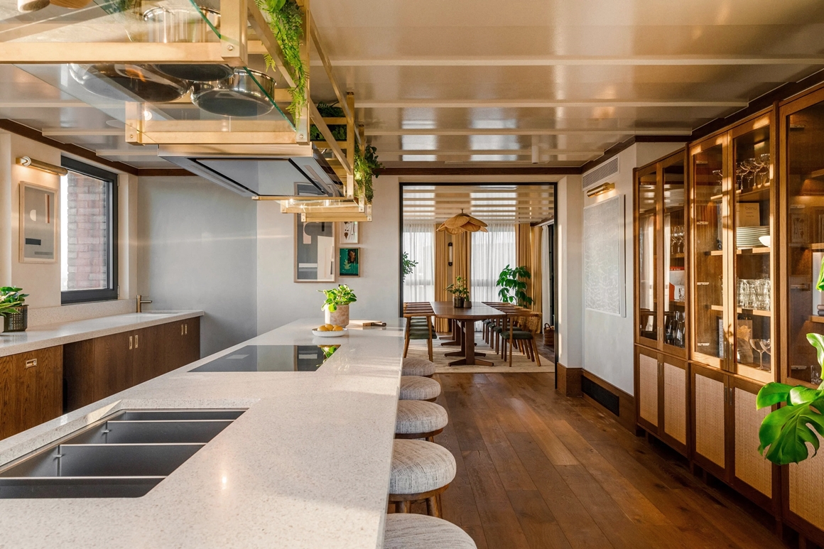 Gian bếp chung thoáng đãng của tòa nhà được trang bị tủ chén sang trọng làm từ gỗ và kính, đi cùng một hệ kệ treo với dàn cây leo xanh mướt dành riêng cho lưu trữ xoong nồi. Tại đây cũng có một phòng ăn rộng rãi với bàn gỗ dài cùng hàng ghế da sang trọng, nơi cư dân có thể dùng bữa với nhau hoặc tổ chức một bữa tiệc riêng tư cùng gia đình.