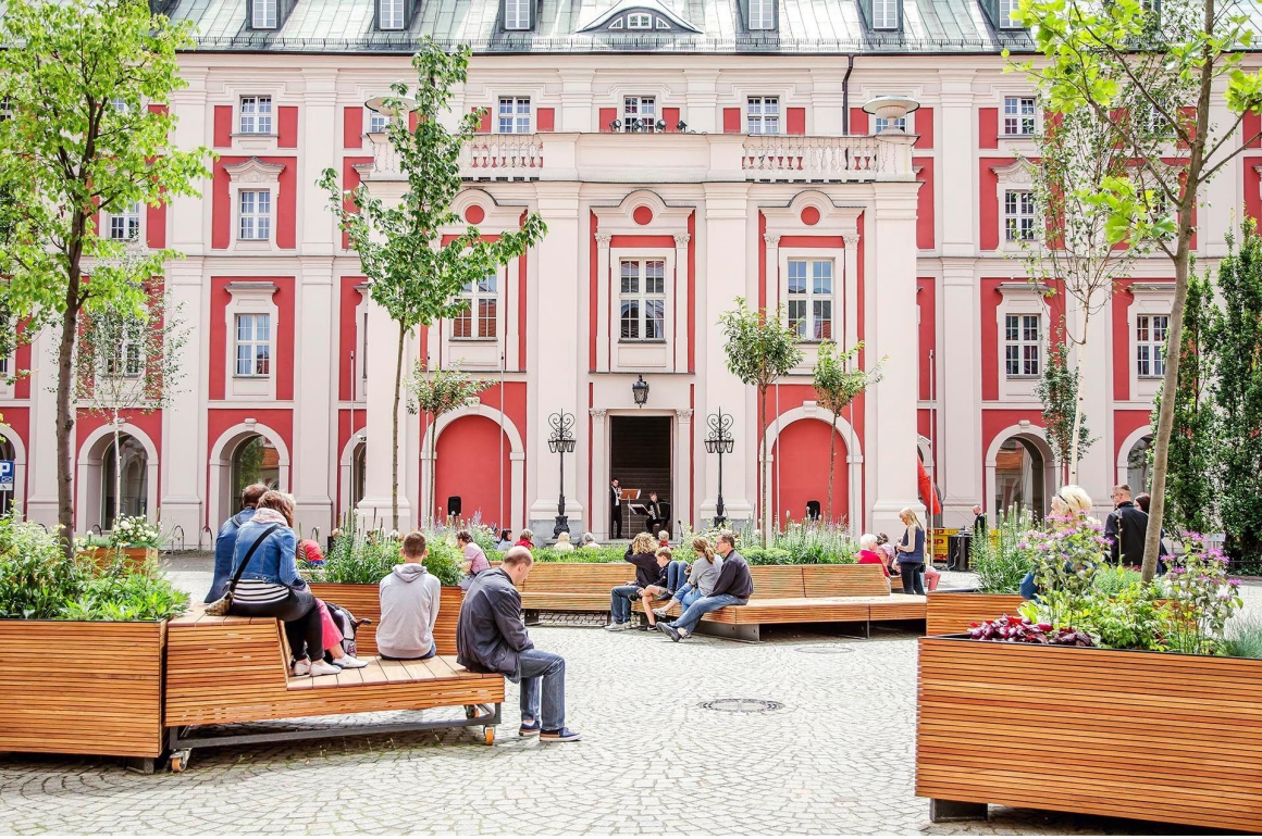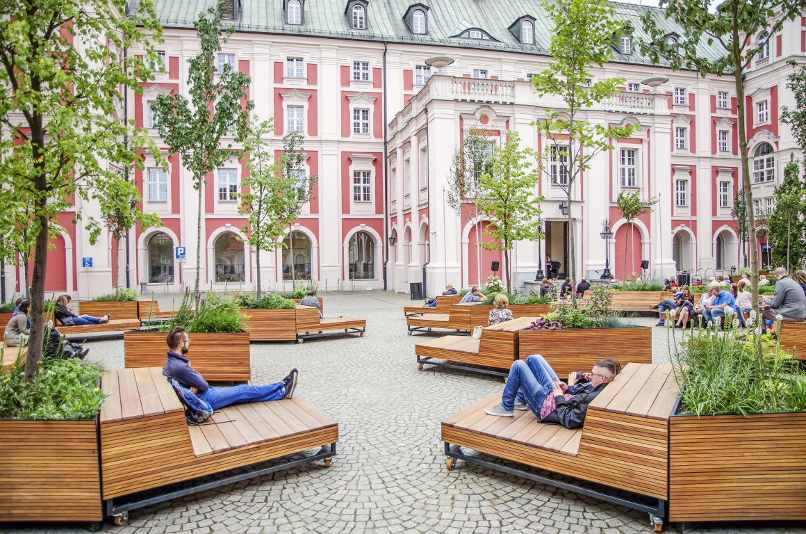 Trước cổng chính của Tòa thị chính nổi bật lên bồn hoa tròn cùng thảm cỏ cao, mang đến cảm giác thân mật và ấm cúng cho không gian đô thị. Các nhà thiết kế đã sử dụng gỗ sáng màu cho các chậu cây và ghế di động nhờ tính năng bền bỉ và thân thiện môi trường. Tất cả hòa quyện và tạo nên tổng thể hài hòa cho một khu vực sinh hoạt chung giữa phố cổ Poznan.