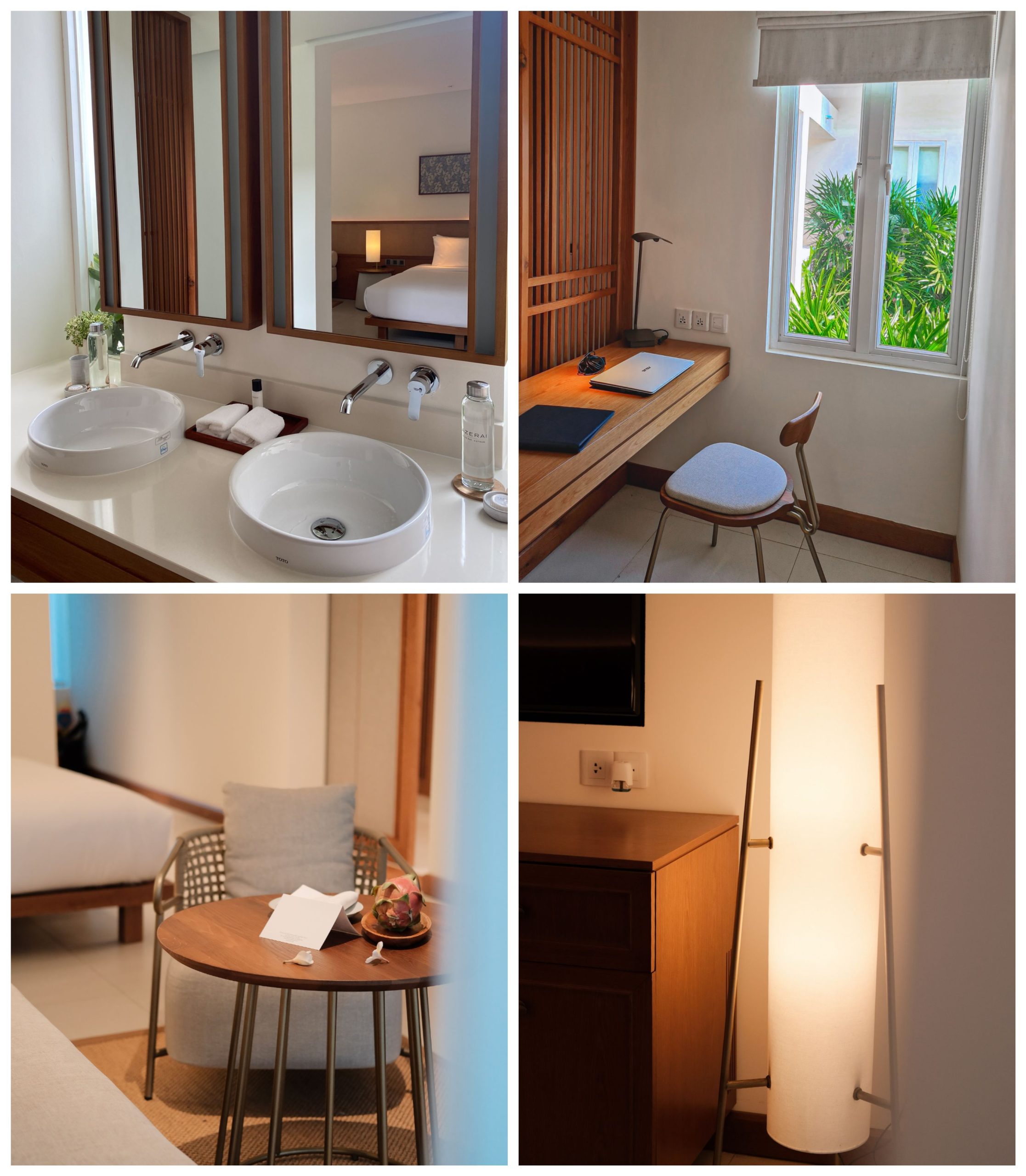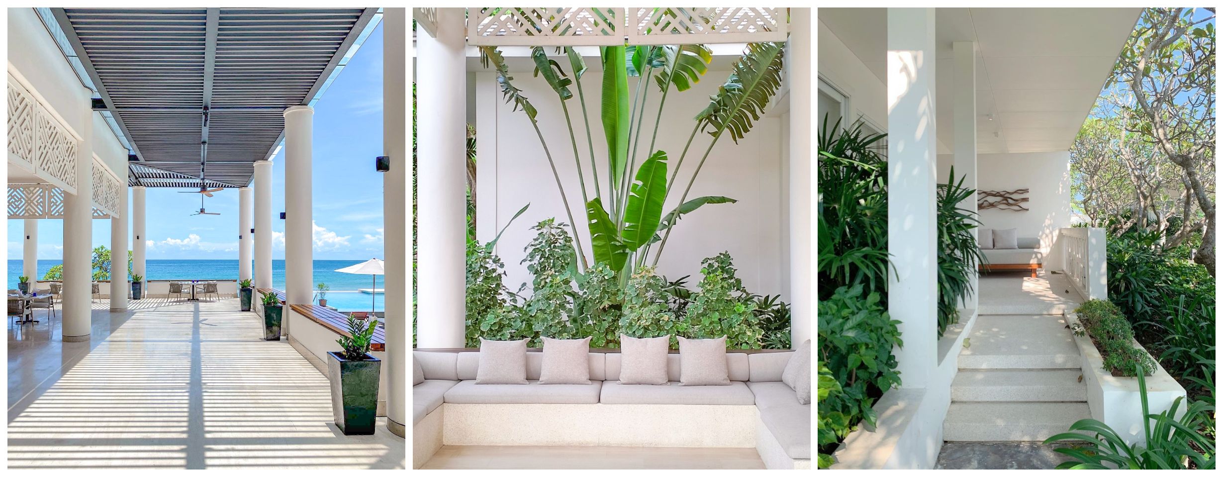 Điều này được thể hiện rõ qua lối bài trí nội thất theo phong cách thẩm mỹ đương đại kết hợp thiết kế tối giản, sử dụng nhiều tông màu như gỗ, beige, xám, trắng tương đồng với màu sắc của cát, đất và đá trong tự nhiên. Phòng Deluxe Suite và Deluxe với hồ bơi hoà mình vào thiên nhiên trong lành, nằm giữa khu vườn xanh tươi với những cây hoa chuối pháo nhiều màu sắc, cây gừng, tán đa cổ kính và những cành cọ đang vui đùa trong gió. Nếu có yêu cầu khắt khe hơn về không gian riêng tư, bạn có thể lựa chọn biệt thự với không gian sinh hoạt lên đến 130m2 hoặc 145m2, bao gồm một giường, một bàn làm việc, một phòng tắm rộng rãi có đầy đủ tiện nghi và một bồn tắm lớn. Tiêu điểm của khu nghỉ dưỡng này chính là Ke Ga Bay Pavilion – biệt thự hai tầng với phòng ngủ chính ở tầng hai nhìn thẳng ra đại dương.
