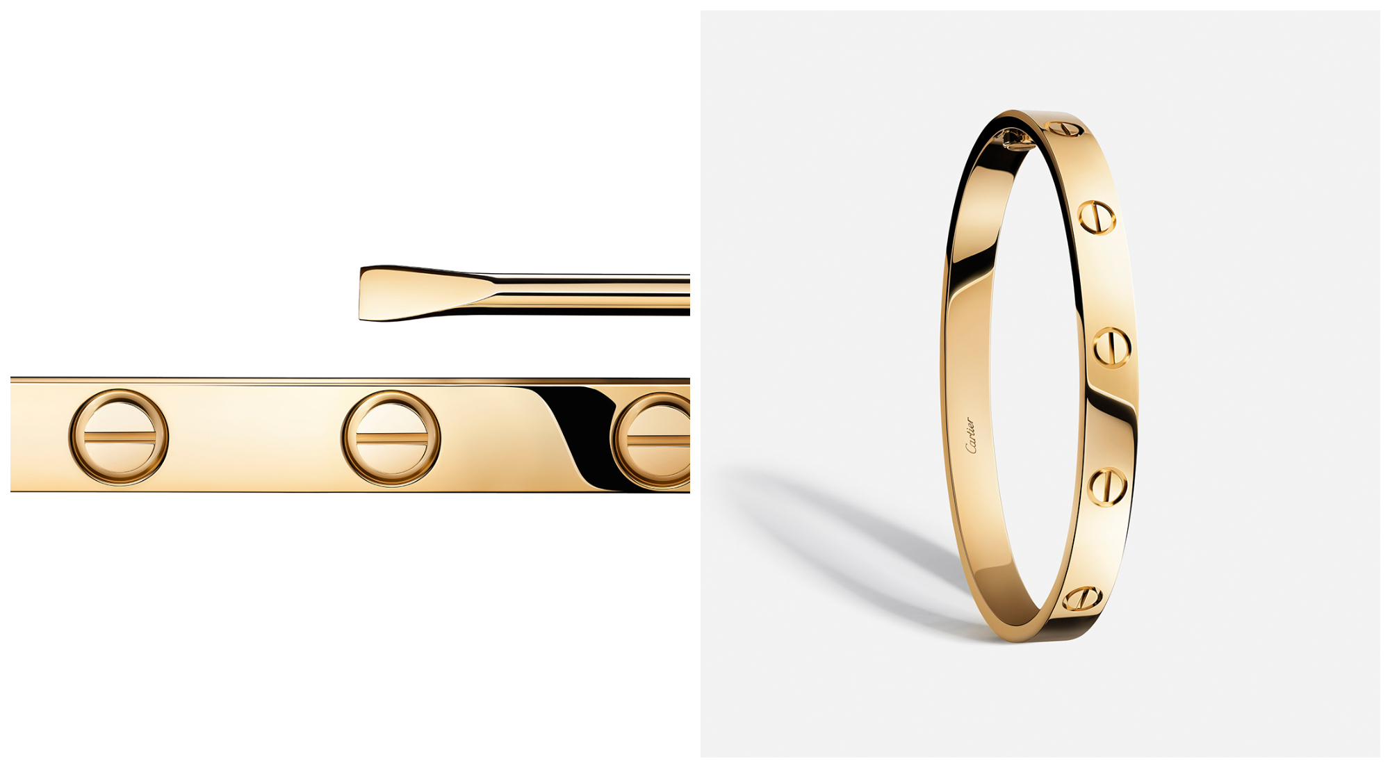 Với Love, Cartier đã đưa ra quyết định cấp tiến là để lộ các vít – được gắn chặt bằng chiếc tua vít đi kèm với vòng. Trực giác tuyệt vời của Maison kim hoàn trứ danh đã giúp họ tìm kiếm và phát hiện ra vẻ đẹp ở cả những chi tiết chức năng bình thường nhất, để mang chúng ra ngoài ánh sáng và dám phô bày với cả thế giới những điều mà các hãng khác thường muốn giấu đi. Tái lập lại thành công của chiếc đồng hồ Santos de Cartier với những chiếc đinh vít xuất hiện trên gờ lắp kính từ năm 1904, vòng tay Love cũng gây ấn tượng ngay từ cái nhìn đầu tiên với bất kể nam hay nữ, với vẻ đẹp thẩm mỹ phi giới tính tuyệt vời. Khi đeo mẫu vòng này trên tay, vị chủ nhân sẽ có trải nghiệm vô cùng thoải mái bởi độ chính xác về tỷ lệ đã được hãng nghiên cứu kỹ lưỡng sao cho ôm sát cổ tay một cách thật tự nhiên. Với tất cả những ưu điểm vượt trội đó, không có gì đáng ngạc nhiên khi Love nhanh chóng trở thành một biểu tượng trường tồn trong làng trang sức cao cấp kể từ khi được Cartier Aldo Cipullo tạo ra ở New York vào năm 1969.