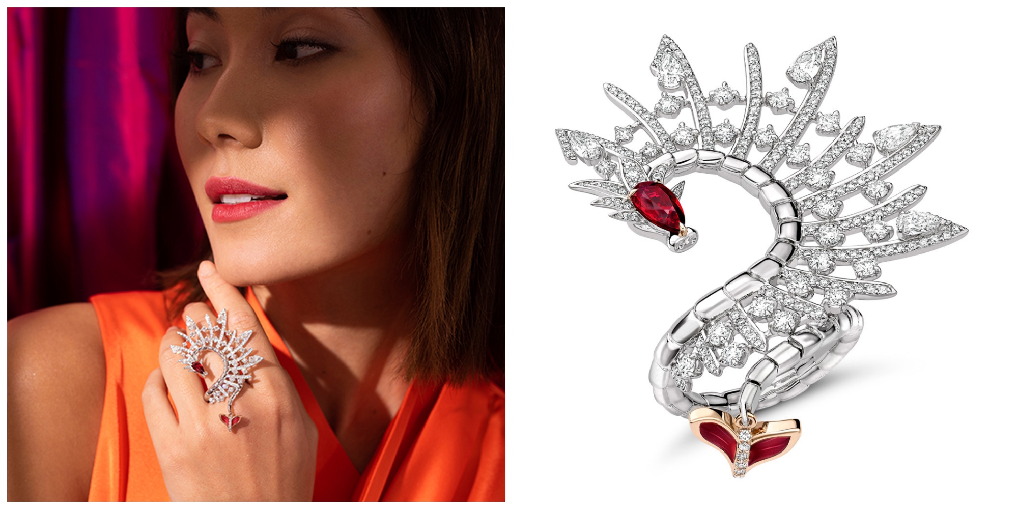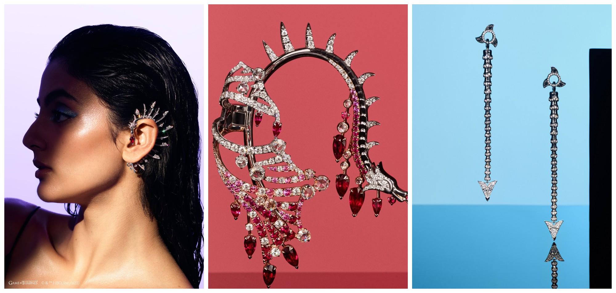 Mang tựa đề ‘Dragon’, chapter đầu tiên trong câu chuyện Fabergé x Game of Thrones High Jewellery gồm năm thiết kế – 3 hoa tai, một nhẫn, một dây chuyền – ngoạn mục đồng giới hạn ở con số 10. Đen và đỏ – gắn liền gia tộc Targaryen đồng thời cũng là màu Daenerys ngày càng ưa chuộng khi sự tự tin ngày càng lớn dần trong cô xuyên suốt bộ truyện – giữ vai trò nòng cốt. Sự hiện diện của màu đỏ, biểu tượng cho tinh thần sôi nổi, đã được Fabergé lồng ghép vào bộ sưu tập thông qua việc sử dụng ruby đỏ sẫm có nguồn gốc rõ ràng từ mỏ Montepuez ở Mozambique sở hữu bởi Gemfields. Tổ hợp đá quý quý hiếm kết hợp vàng trắng, vàng hồng, kim cương cùng rhodium đen kiến tạo ngoại diện hoàn mỹ cho từng tuyệt phẩm trang sức.