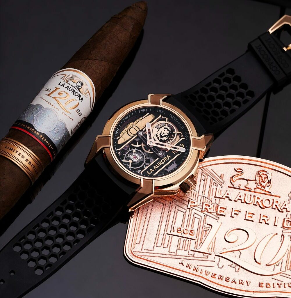 Thương hiệu xì gà đẳng cấp thế giới La Aurora đánh dấu sinh nhật tuổi 120 với La Aurora 120th Anniversary cigar và thiết kế đồng hồ Epic X ấn tượng thực hiện bởi Jacob & Co.. Từng chiếc đồng hồ vàng hồng quý giá thêm phong cách khi song hành cùng hộp giữ ẩm tùy chỉnh cũng như 10 điếu xì gà phiên bản kỉ niệm.