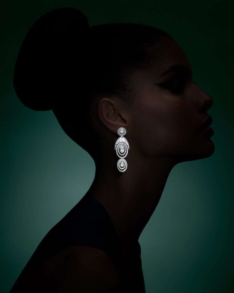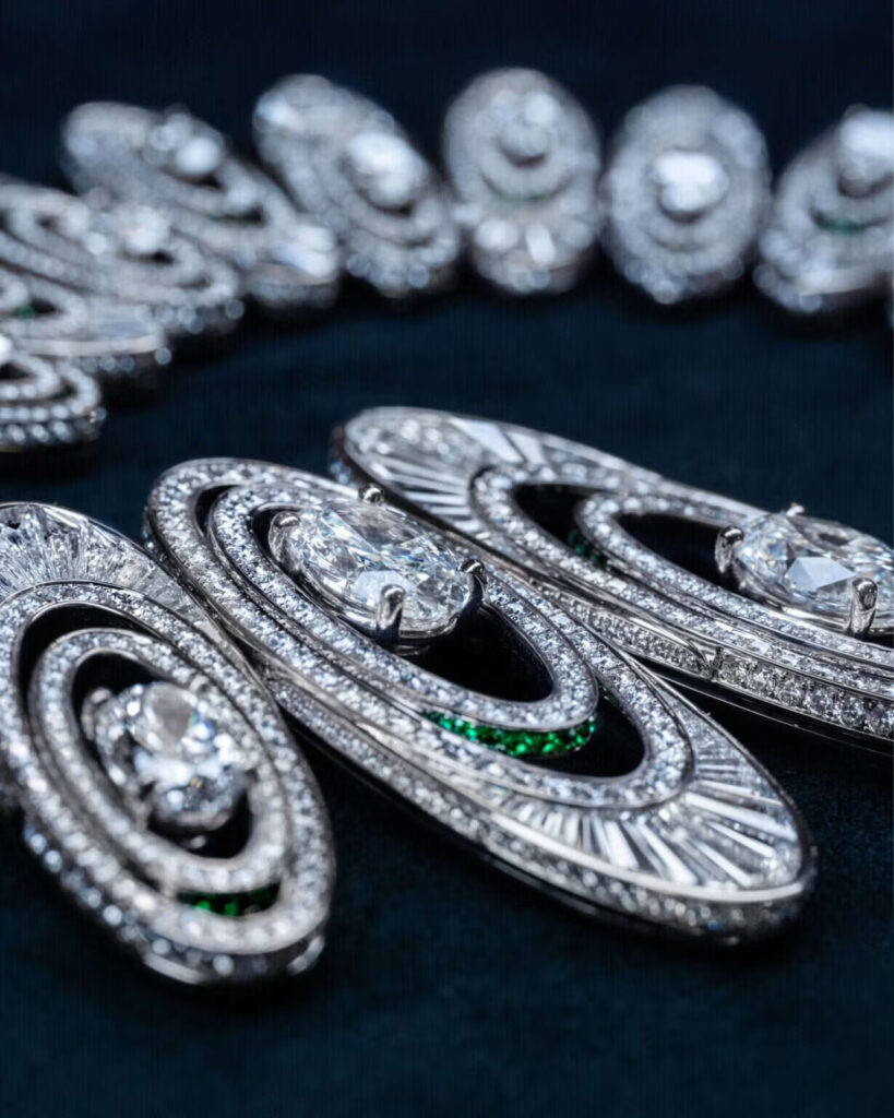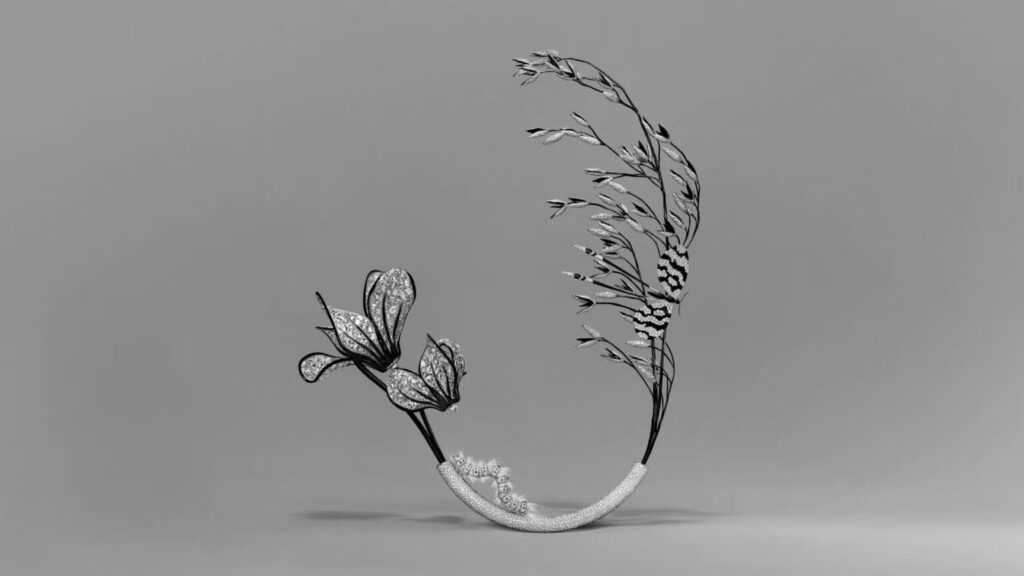 oucheron gây ấn tượng với Impermanence – bộ sưu tập lấy cảm hứng từ vẻ đẹp mong manh của thiên nhiên và nghệ thuật cắm hoa ikebana Nhật Bản. Những chú chuồn chuồn khảm xà cừ và sapphire, hay cánh bướm bạc đính trên vai, biến trang sức thành những tác phẩm điêu khắc sống động, đòi hỏi tới 18.000 giờ chế tác.