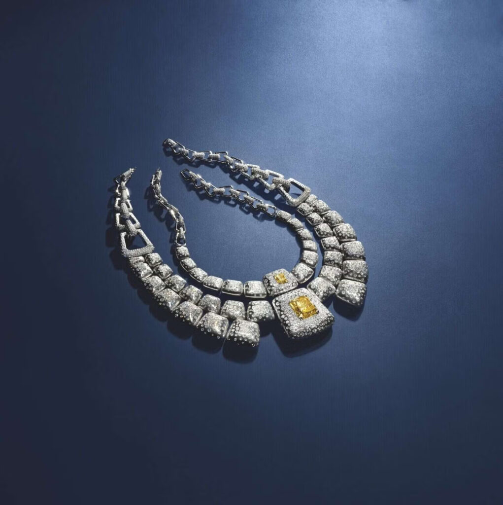 Graff tôn vinh thập niên 1960 với 1963 Collection, nổi bật bởi cấu trúc oval đồng tâm nạm hơn 7.790 viên kim cương, tổng cộng 129 carat, cùng điểm nhấn pavé emerald kín đáo, gợi nhắc sắc xanh biểu tượng của thương hiệu.