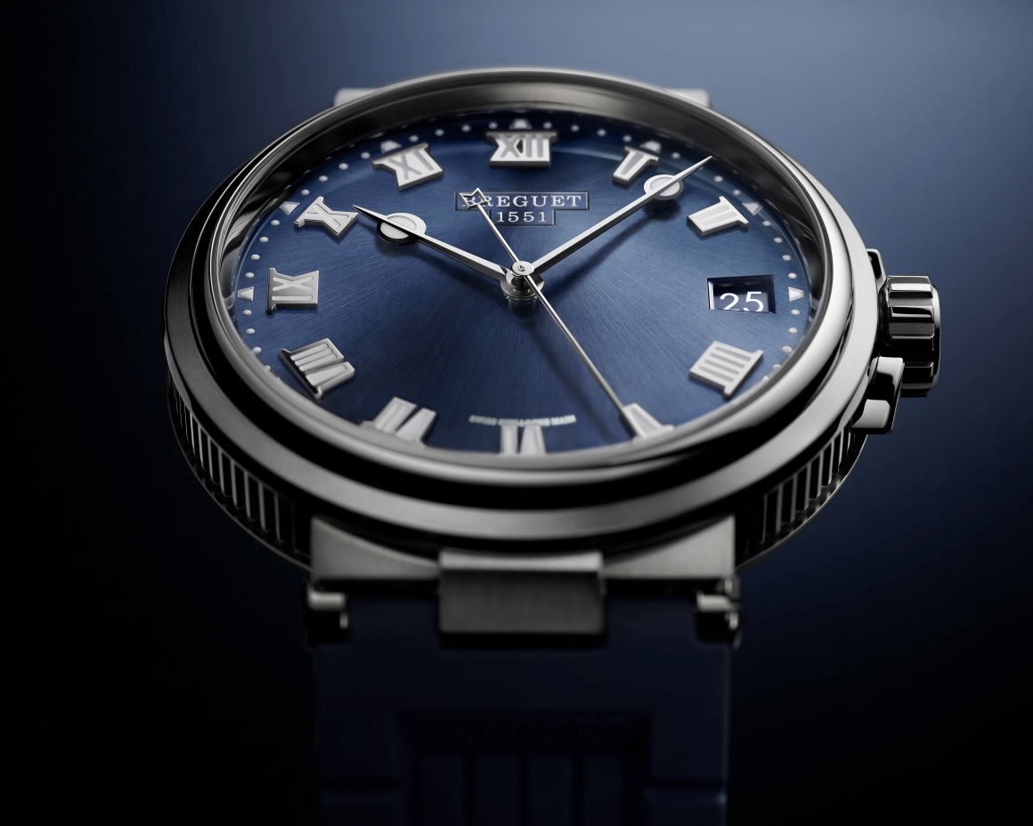 Kể từ năm 2019, Breguet cũng đã cung cấp vòng đeo titan nhằm nhấn mạnh khía cạnh hiện đại. Giờ đây, nhà chế tác phú cho các mẫu Marine titan một mặt số với lớp hoàn thiện thủ công chải tia mặt trời tuyệt đẹp. Các đường nét vô cùng tinh xảo kéo dài từ khung chứa tên thương hiệu đến các rìa mặt số. Và sắc xanh phủ lên nó gợi nhớ đến biển cả mênh mông, như một lời tri ân tinh thần của bộ sưu tập.