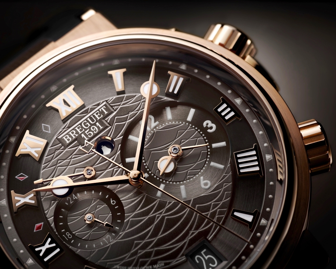 Được đảm trách bởi đội ngũ nghệ nhân engine-turning xuất sắc, kỹ thuật thủ công guillochage luôn đóng vai trò quan trọng trong việc tô điểm cũng như họa thêm nét đặc sắc cho những chiếc đồng hồ Breguet nói chung và Marine nói riêng. Làm nổi bật các hiển thị khác nhau trên mặt số và cực kỳ phức tạp trong thiết kế, guillochage ở đây được thể hiện bằng màu xám đá phiến, mang đến sự tương phản ngoạn mục với sắc thái sâu thẳm của vàng hồng.