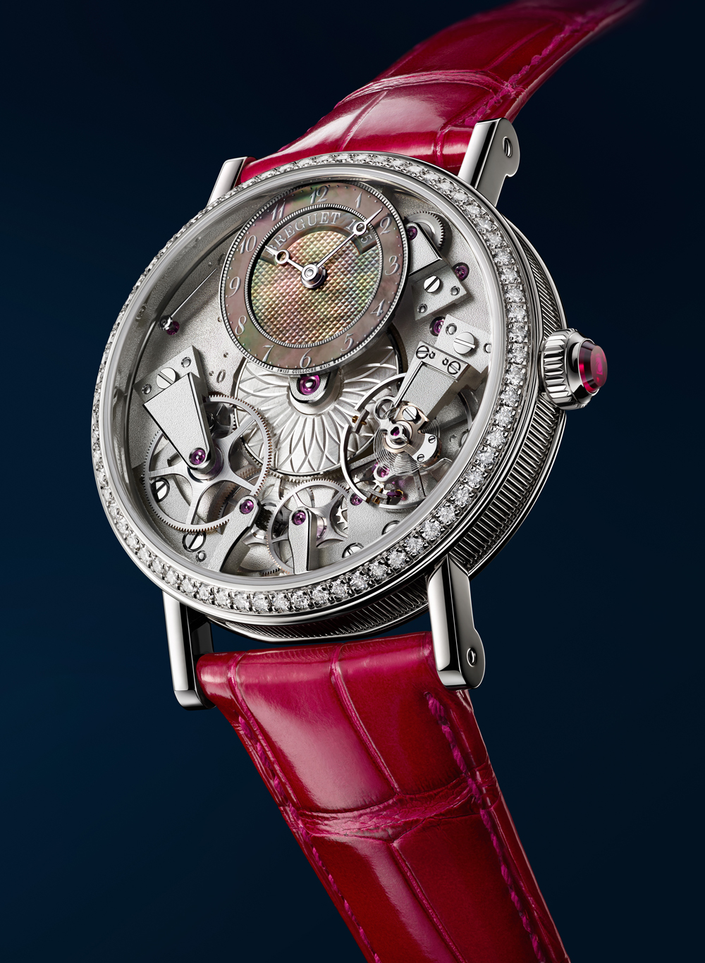 Cầu nối mang bộ thoát được gia cố bằng một máng trượt vát bằng tay – vốn được Breguet phát minh nhằm bảo vệ cán cân khỏi những cú sốc. Về mặt hiển thị, Tradition Dame 7038 truyền đạt thời gian trên mặt số bằng xà cừ Tahiti. Về mặt hoàn thiện bộ máy, nhà sản xuất đã ưu ái trang trí theo một cách thức rất đỗi nữ tính. Cách xử lý NAC đặc trưng của bộ sưu tập Tradition thường xuất hiện trong tông màu xám, thanantraxit hoặc vàng hồng, thì nay được thay thế bằng bộ máy trắng tuyết nằm gọn trong bộ vỏ vàng trắng 18K 37mm. 68 viên kim cương quý giá được tỉ mỉ nạm trên viền lắp kính và một viên ngọc ngạo nghễ tỏa sáng trên núm vặn càng góp phần tỏa ra hào quang lấp lánh trên cổ tay vị nữ chủ nhân sành điệu.