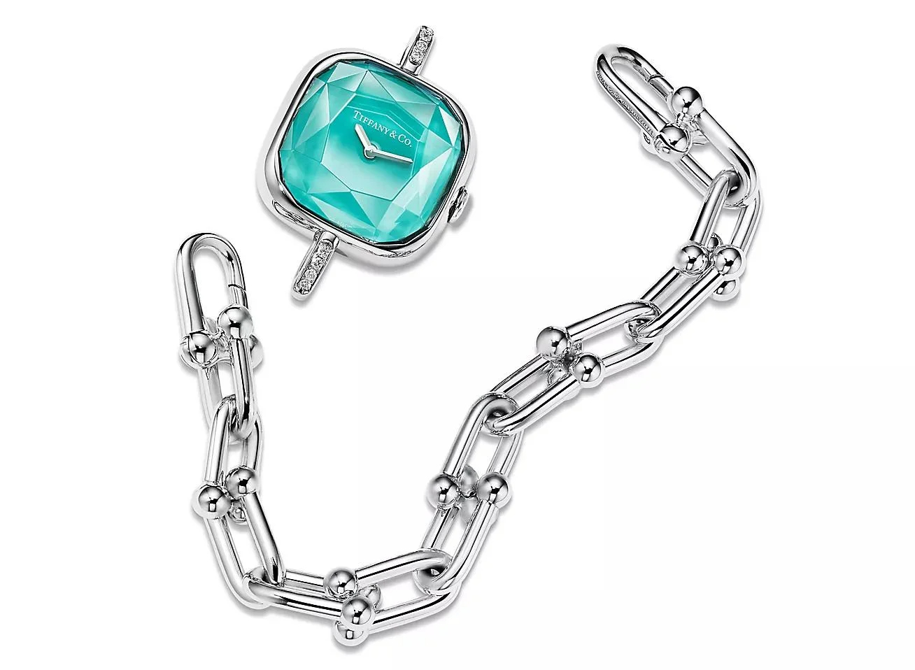 Đồng hồ HardWear by Tiffany với vỏ thép không gỉ, dây bạc sterling, và mặt số sơn mài Tiffany Blue “crush” đặc trưng