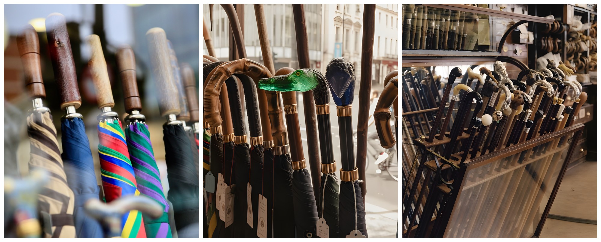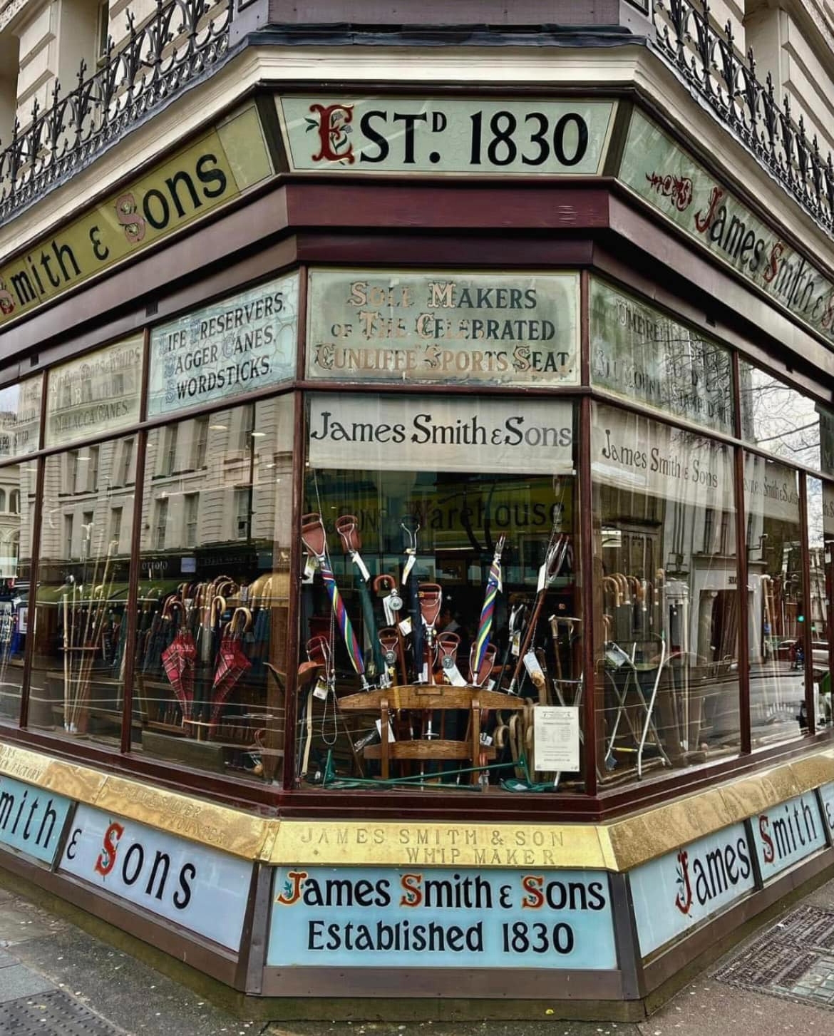 Các quý ông ở London đã tin tưởng giao phó việc chế tác ô cho James Smith & Sons trong hơn 185 năm. Cho dù kết hợp mũ quả dưa với ô Slim Rolled Umbrella, sử dụng mẫu ô Solid Stick Umbrella như một chiếc gậy hỗ trợ đi bộ, cửa hàng ô nhỏ ở góc phố New Oxford vẫn tấp nập người ra kẻ vào chỉ để tìm kiếm cho mình những chiếc ô chất lượng tốt nhất. Tọa lạc tại số 53 New Oxford Street, cách Bảo tàng Anh chỉ một quãng không dài, cửa hàng như cánh cửa dẫn ta trở về một thời đại đã qua hàng trăm năm; được bao bọc bởi những bức tường gỗ gụ chất đầy những cây gậy đi bộ, gậy gỗ, đầu nai, áp kế và đồng hồ. Trên quầy kính cũ kỹ, những cuốn sổ đặt hàng và sổ cái lót da nằm yên lặng lẽ với đầy những nét phác thảo nguệch ngoạc; minh chứng cho danh sách rất dài những khách hàng sành sỏi đã và đang chờ đợi để sở hữu một chiếc ô từ James Smith & Sons. Không chỉ dừng lại ở đó, một không gian khá lớn bên trong cửa hàng còn dành riêng cho những chiếc gậy đi bộ, gậy nông thôn và gậy yên xe dành cho những ai có đầu gối yếu.