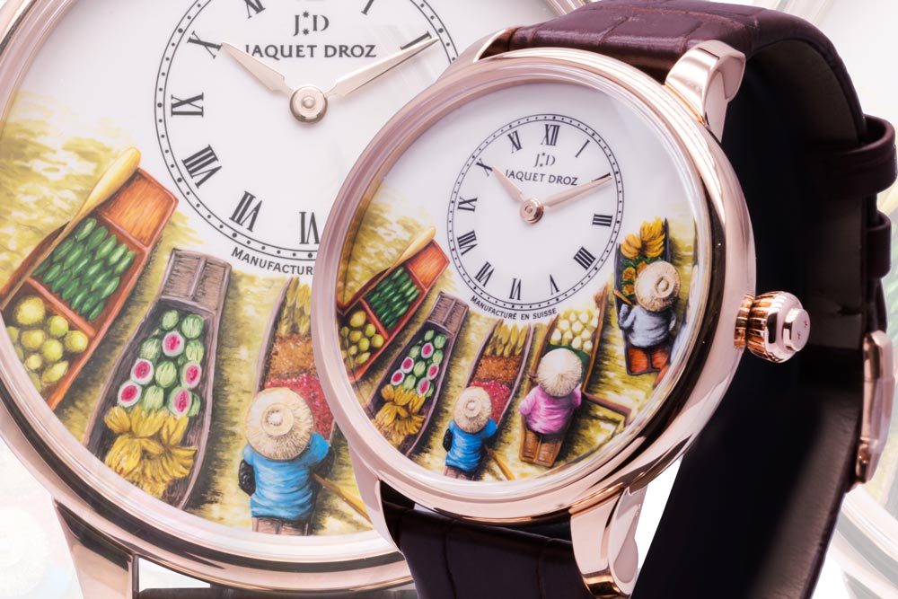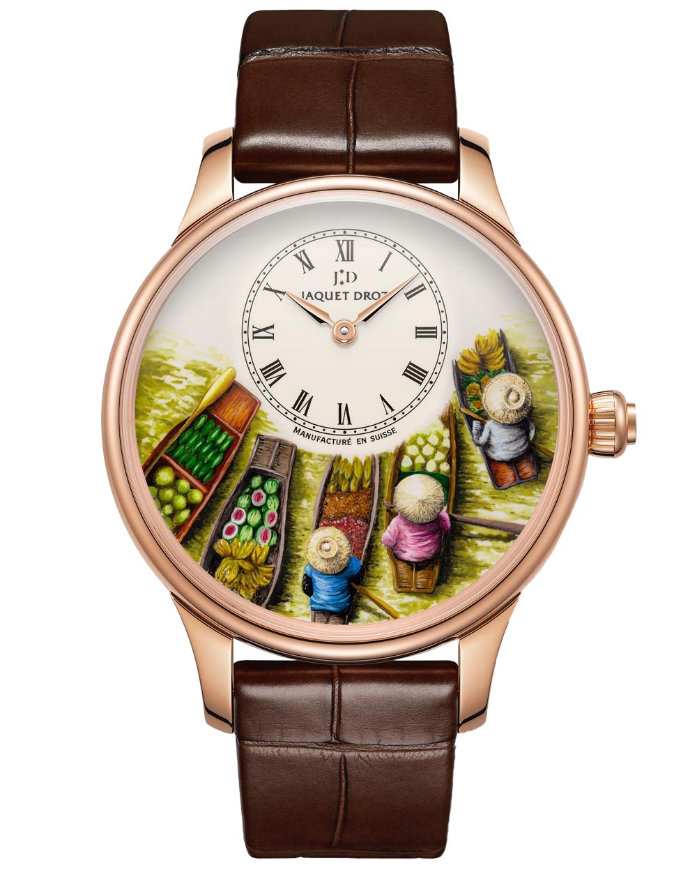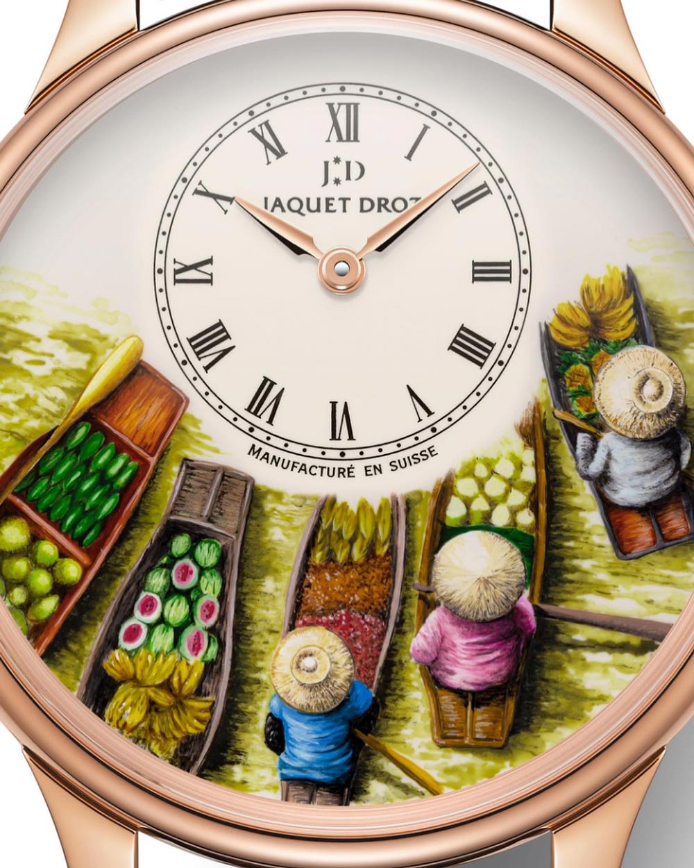 Vẻ đẹp trù phú của chợ nổi đã được lột tả sống động như thế qua bức tranh tiểu họa độc nhất từ Jaquet Droz, thể hiện trọn vẹn mảng màu nổi bật bao quanh bởi văn hóa sông nước vốn đã ăn sâu vào tiềm thức của mỗi người dân miền Tây, một hình ảnh vừa linh thiêng vừa đời thường như nếp sinh họat giàu bản sắc văn hóa. Tổng hòa từ những biểu tượng đặc trưng đó, độc bản Petite Heure Minute Floating Market sẽ đánh thức nhịp sống của “phố thị sông nước” miền Tây Nam Bộ Việt Nam thông qua bức tranh tiểu họa được bao quanh bằng bộ vỏ vàng đỏ 18K với kích thước 39mm.