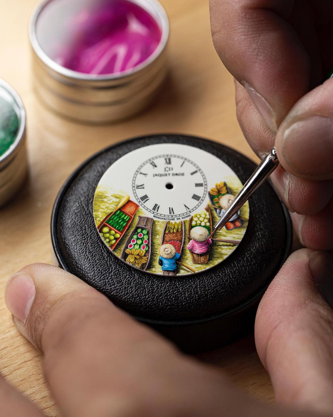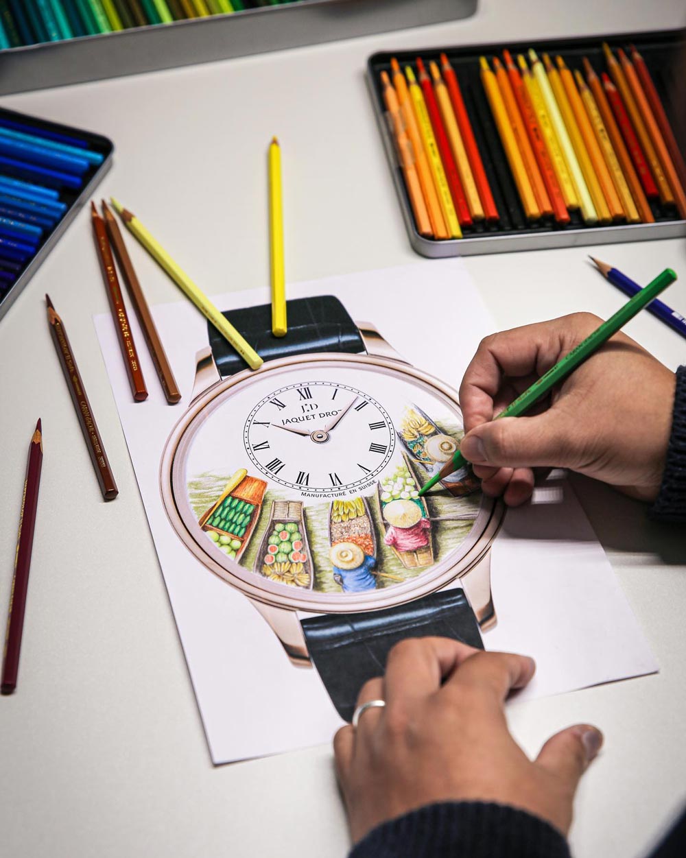Các nghệ nhân cho dù là họa sĩ, thợ chạm khắc hay thợ tráng men thì đều làm chủ nghệ thuật của sự tương phản, một trong những nét độc đáo khác biệt của Atelier d’Art. Tương phản giữa những kỹ thuật truyền thống và ngôn ngữ thẩm mỹ hiện đại, giữa kỹ thuật tráng men Grand Feu của thiết kế cổ điển và bức tranh tiểu họa sống động, tất cả đều được phô diễn sắc nét để cho ra đời một tác phẩm mang vẻ đẹp rực rỡ vượt thời gian. Trên mặt số mịn màng của tuyệt phẩm, kỹ thuật vẽ tiểu họa giàu bản sắc từ Jaquet Droz mang đến một bức tranh sống động chưa từng có. Con người, trái cây, con thuyền và phong cảnh được vẽ bằng tay một cách kì công, tỉ mỉ. Người họa sĩ đã làm mọi thứ bằng tay với sự hỗ trợ của kính hiển vi và những dụng cụ được chọn lọc một cách cẩn thận. Chẳng hạn như bút vẽ lông phải thực sự vừa vặn với bàn tay và vừa vặn cho chi tiết cần được vẽ. Do vậy, phải mất đến vài tháng để làm ra một chiếc bút lông mà hình dạng của nó đáp ứng được yêu cầu của họa sĩ như kích thước phù hợp để vẽ những chi tiết như trái cây, con thuyền… kể cả tóc hay những đặc điểm tinh tế khác.