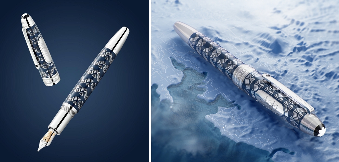 Mỗi chiếc bút máy có được khắc hoa văn hình sóng và biểu tượng con tàu hơi nước trên nắp phủ bạch kim, trong khi cài bút được làm bằng sơn mài mờ màu xanh lam với hiệu ứng chuyển màu tinh tế.