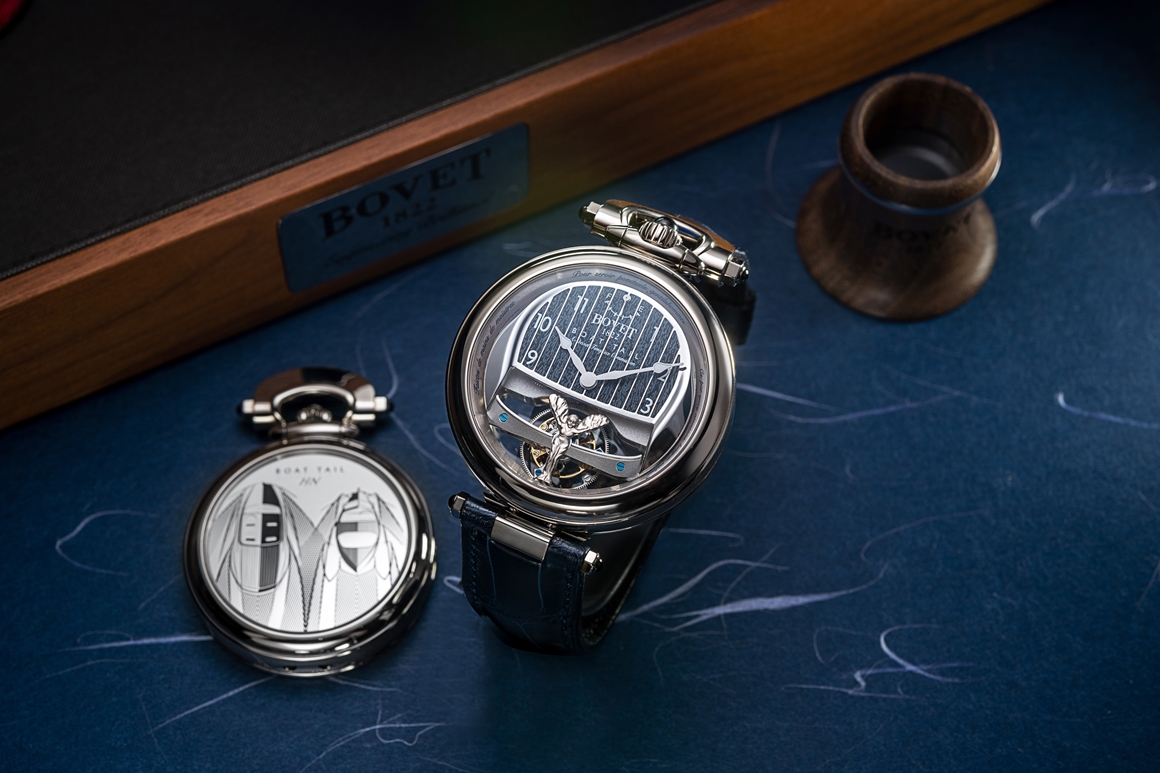 Cả hai mặt số phía sau đều được trang trí bằng các tác phẩm điêu khắc Bespoke hình chiếc Boat Tail. Các họa tiết này được thực hiện hoàn toàn bằng tay, khắc hoạ hoàn chỉnh các chi tiết bánh xe, tay nắm cửa, gương và các chi tiết tinh xảo khác. Đội ngũ của Rolls-Royce và BOVET 1822 đã hợp tác chặt chẽ với nhau để đảm bảo lớp sơn mài của tác phẩm nghệ thuật này mang màu ton sur ton với chiếc động cơ ô tô cỡ lớn.