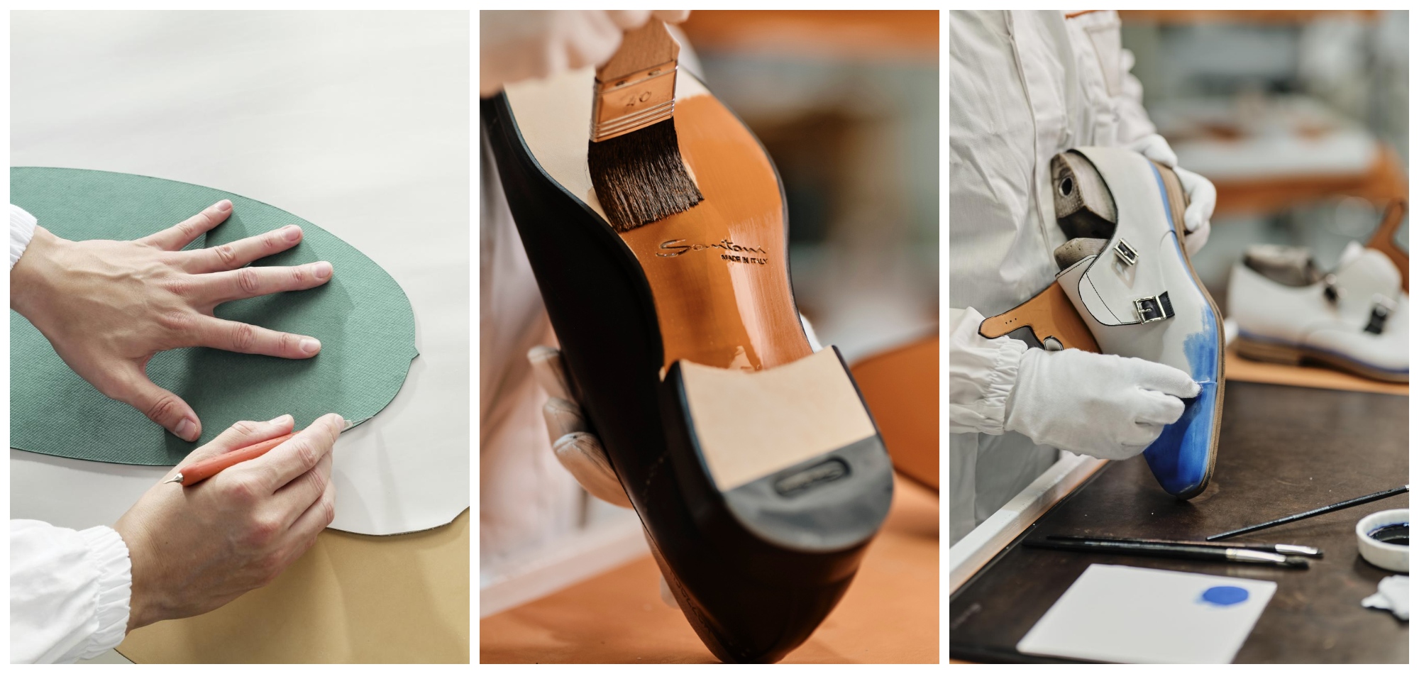 Về cách thương hiệu sử dụng các nguyên liệu thô đó, một trong những khía cạnh nổi bật nhất khi tham quan nhà máy Santoni là sự tập trung như Zen mà các công nhân, trong một khu vực đầy tiếng ồn ào của máy móc, áp dụng vào các công việc mà họ đã cống hiến cả đời (từ cắt và may phần trên đến gắn gót, làm khuôn giày, tạo hình đế ngoài và khâu Goodyear).