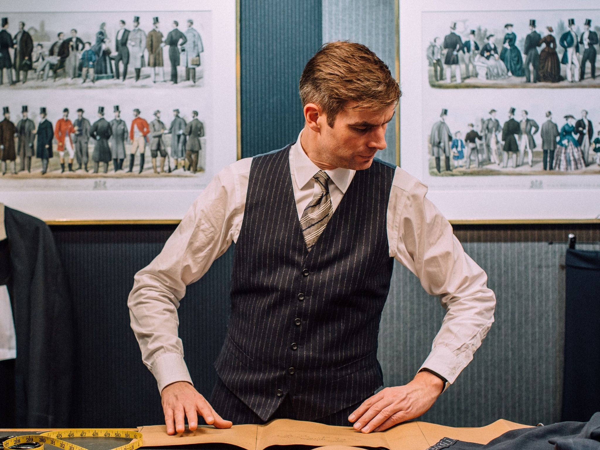 Bước vào phòng trưng bày của Huntsman tại số 11 phố Savile Row giống như bước vào một nơi tôn nghiêm hay bảo tàng may đo. Tính thẩm mỹ đầy nam tính thể hiện rõ trên sàn gỗ, kệ gỗ và tường màu kem, tất cả đều được thiết kế để trưng bày những tuyệt tác tinh xảo nhất. Những ma-nơ-canh mặc những bộ vest, khăn quàng cổ, mũ và giày lười được may đo hoàn hảo làm nổi bật từng đường kim mũi chỉ đã trở thành tâm điểm của Huntsman.