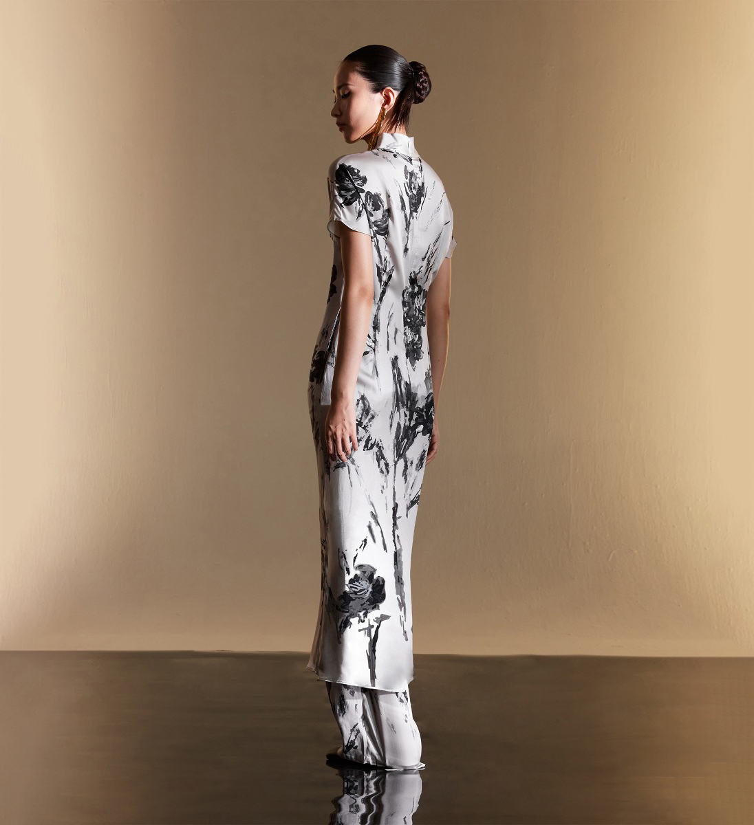 Sườn xám bằng vải lụa in họa tiết hoa