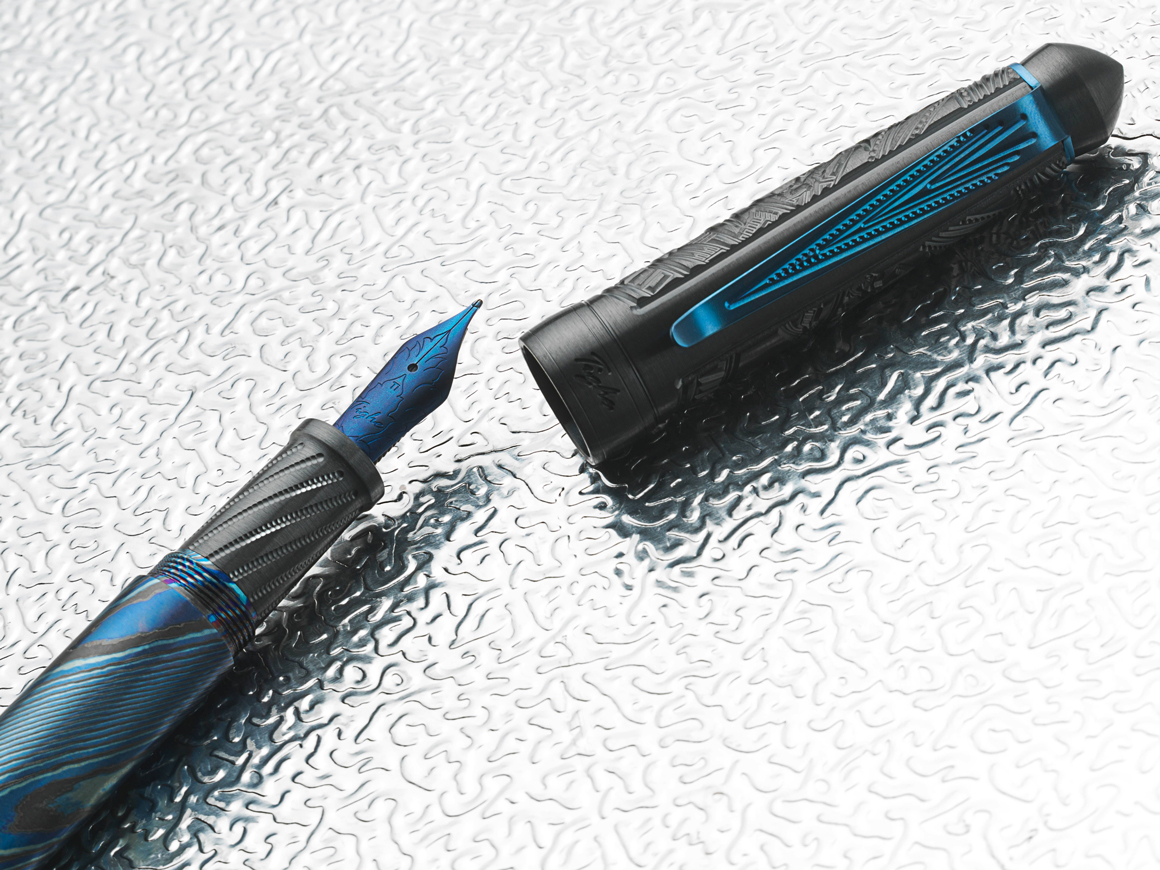 Trong khi đó, màu xanh tuyệt đẹp từ chất liệu thép của phiên bản Titanium Mokume-Gane đem tới sự phá cách so với tông màu vàng của trống đồng Đông Sơn truyền thống. Ngòi bút bằng titanium của phiên bản này mang màu xanh đặc trưng do đã nung qua lửa, tương tự với kỹ thuật làm kim đồng hồ Thụy Sỹ cao cấp.