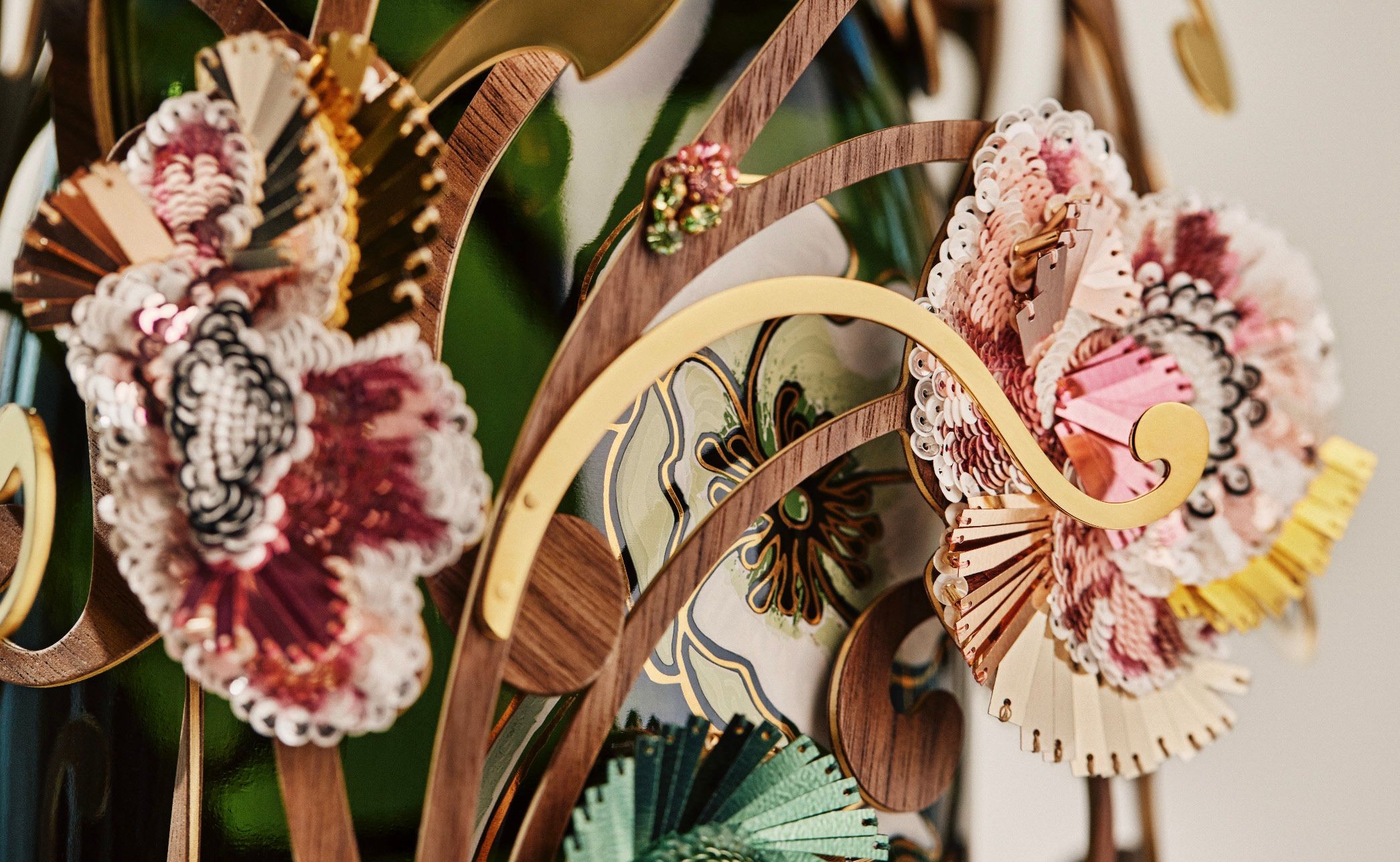 Quyến rũ với muôn hoa và lá, Ode à la Nature – Edition Volutes thực sự là bản tình ca tán dương cả thiên nhiên lẫn chuyên môn khéo léo. Được thực hiện thủ công bởi một người thợ mộc trong quá trình tỉ mỉ mất 20 giờ, cấu trúc thành hình từ những vòng xoáy lồng vào nhau của gỗ óc chó và đồng thau đánh bóng. Những vòng xoáy đồng thau tiếp tục trải qua quá trình mạ vàng 24K kéo dài 7 giờ. Sau đó, họa tiết thêu được gắn tinh tế vào cấu trúc phức tạp này. Nghệ nhân sử dụng 8.000 hạt cườm kết hợp kim sa với 30 sắc thái hồng, trắng, vàng, xanh lá cây để tạo nên hoa, lá trên vải organza lấp lánh sức sống. Thêm vào đó, bảy mươi viên pha lê giúp tăng cường vẻ rực rỡ và tinh tế, trong khi nhụy một số bông hoa điểm xuyết hạt thủy tinh trắng. Được ứng dụng đa dạng chất liệu và kỹ thuật Haute Couture, bao gồm Lunéville và thêu kim, từng tác phẩm cần tới 160 giờ hoàn thiện.
