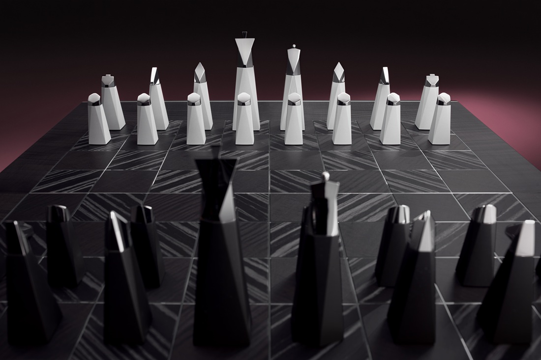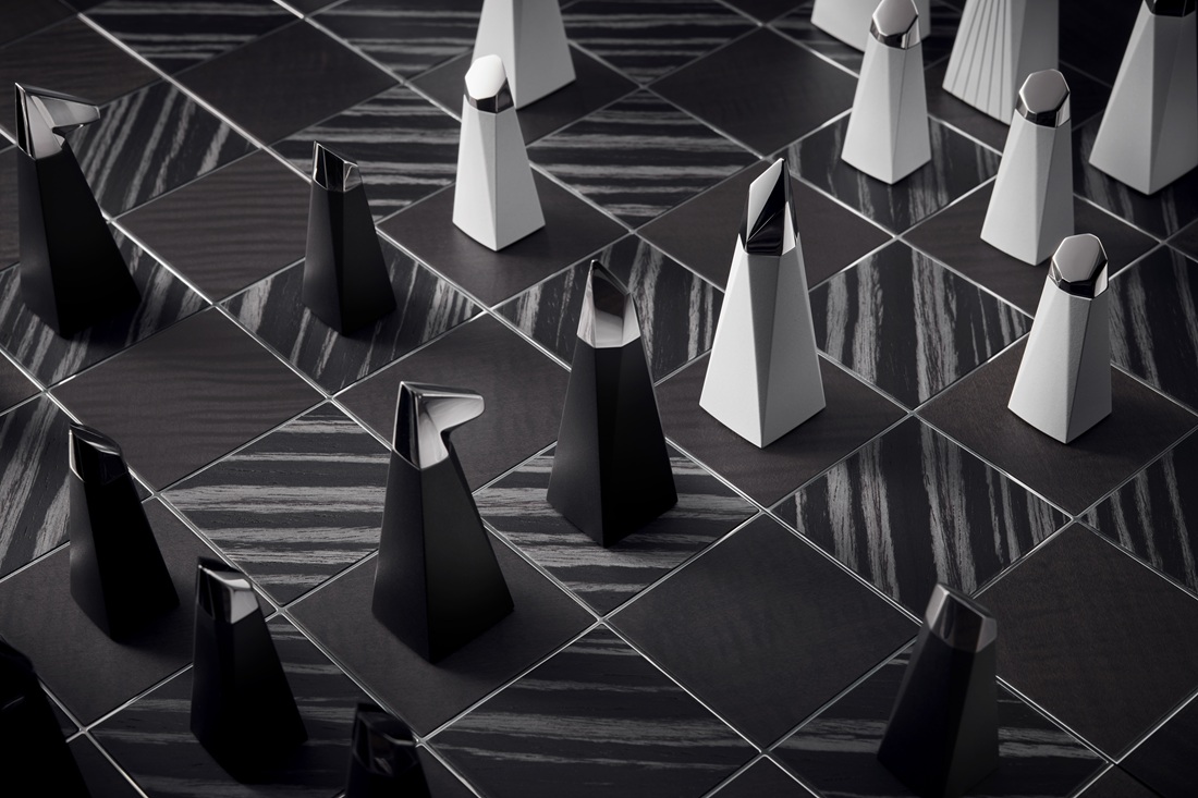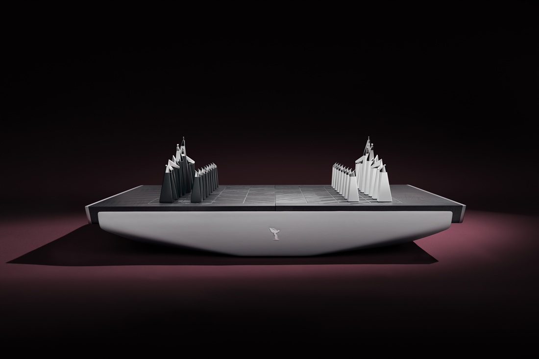 Mỗi quân cờ là một tác phẩm điêu khắc, chế tác từ nhôm phủ gốm cao cấp, điểm xuyết thép không gỉ đánh bóng – mang lại cảm giác cầm nắm tương tự nút chỉnh biểu tượng trong khoang lái Rolls-Royce. Hệ thống nam châm ẩn dưới mặt bàn được nghiên cứu và thử nghiệm với sáu mức từ tính khác nhau, đảm bảo từng quân cờ di chuyển ổn định mà vẫn nhẹ nhàng, tinh tế.