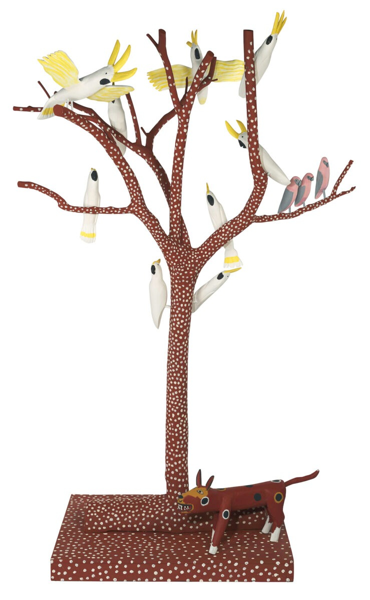 Tác phẩm điêu khắc của Keith Wikmunea mô tả hình dáng của một cái cây mảnh mai được sơn màu đỏ xen kẽ ochre trắng. Đậu trên cành là bầy vẹt đuôi dài màu hồng đang giương cao đôi cánh bên cạnh ba con vẹt bầu màu hồng và xám. Thấp thoáng ta có thể thấy một chú chó vằn đứng ở dưới gốc cây.