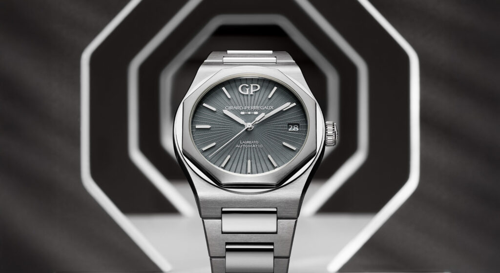 Laureato 42mm phiên bản mới của Girard-Perregaux là lời tán dương nghệ thuật chế tác đỉnh cao – với mặt số tráng men Grand Feu xám được thực hiện bởi Donzé Cadrans. Họa tiết tia mặt trời tinh xảo kết hợp kỹ thuật phủ men nhiều lớp, nung ở 800°C, tạo nên độ sâu thị giác quyến rũ và khả năng chống phai vượt trội. Vỏ thép không gỉ đường kính 42mm với vòng bezel bát giác đặc trưng, phối giữa chải xước và đánh bóng. Bộ máy GP01800 tự động dày chỉ 3.97mm, dự trữ năng lượng 54 giờ, được hoàn thiện thủ công với rotor vàng hồng và các đường vân trang trí sắc nét. Không dạ quang, không vạch phút – phiên bản này là đỉnh cao của sự tiết chế và tinh tế, dành cho những ai yêu sự sang trọng thầm lặng.
