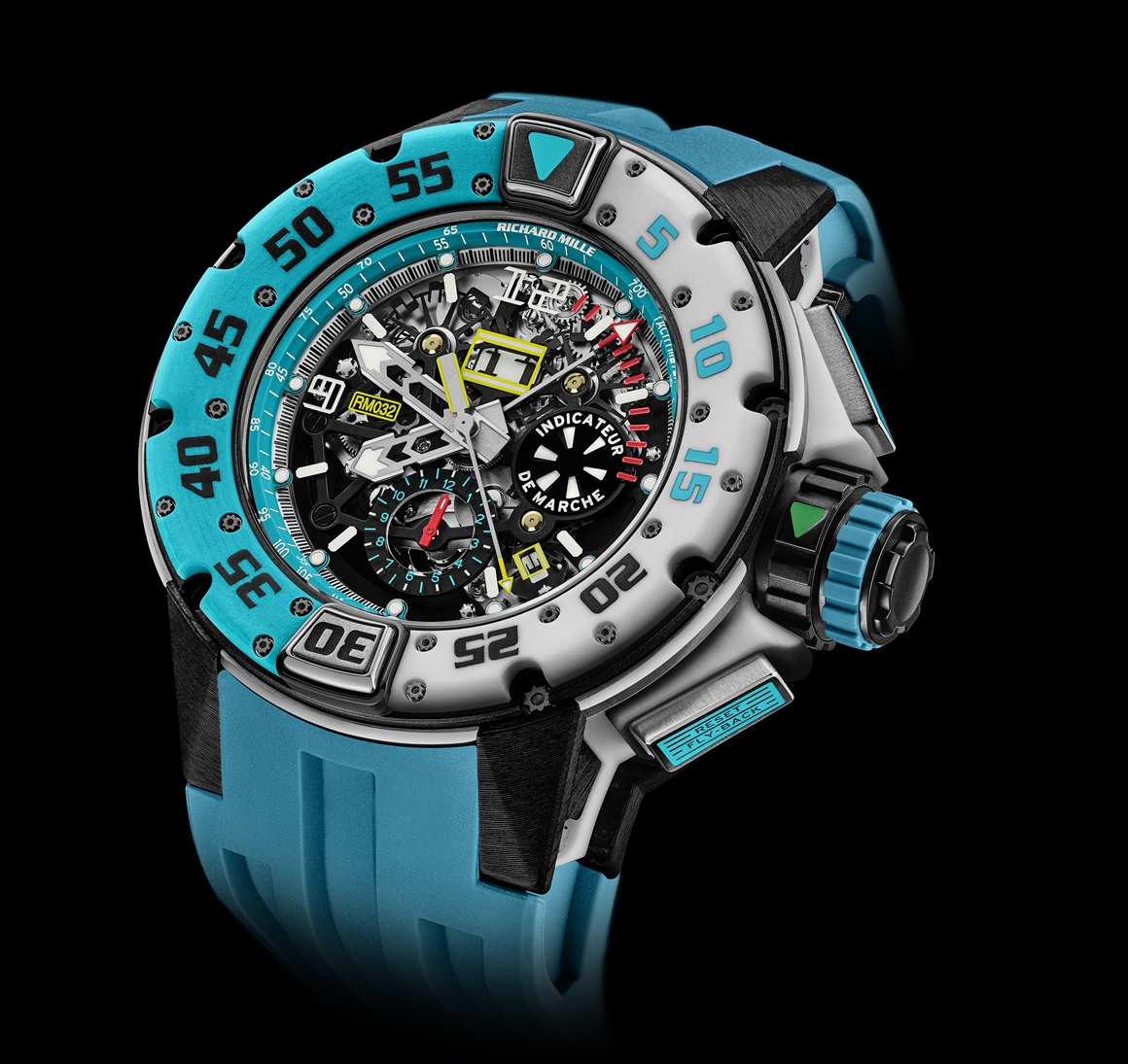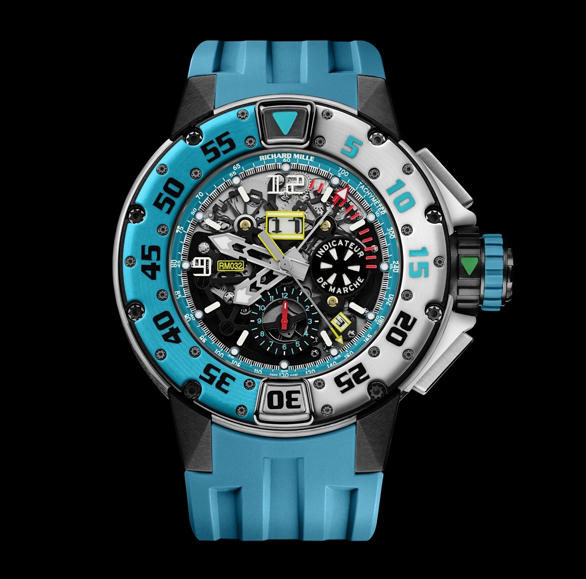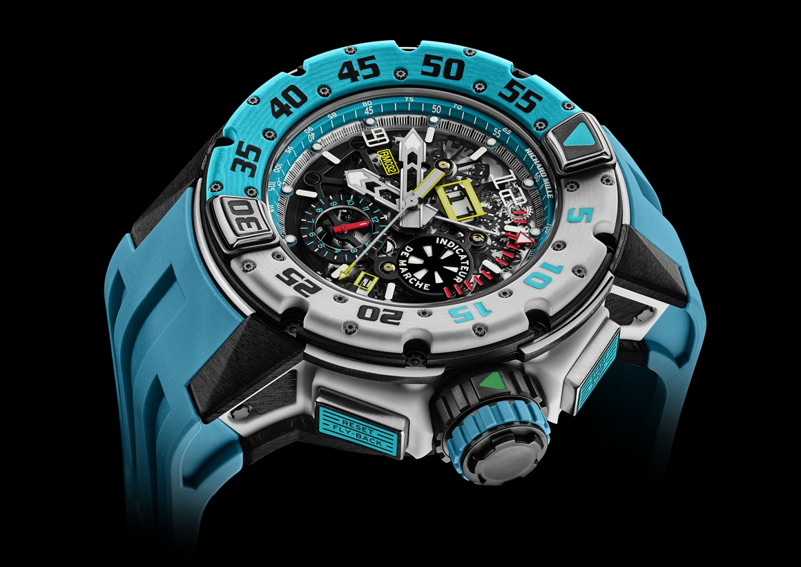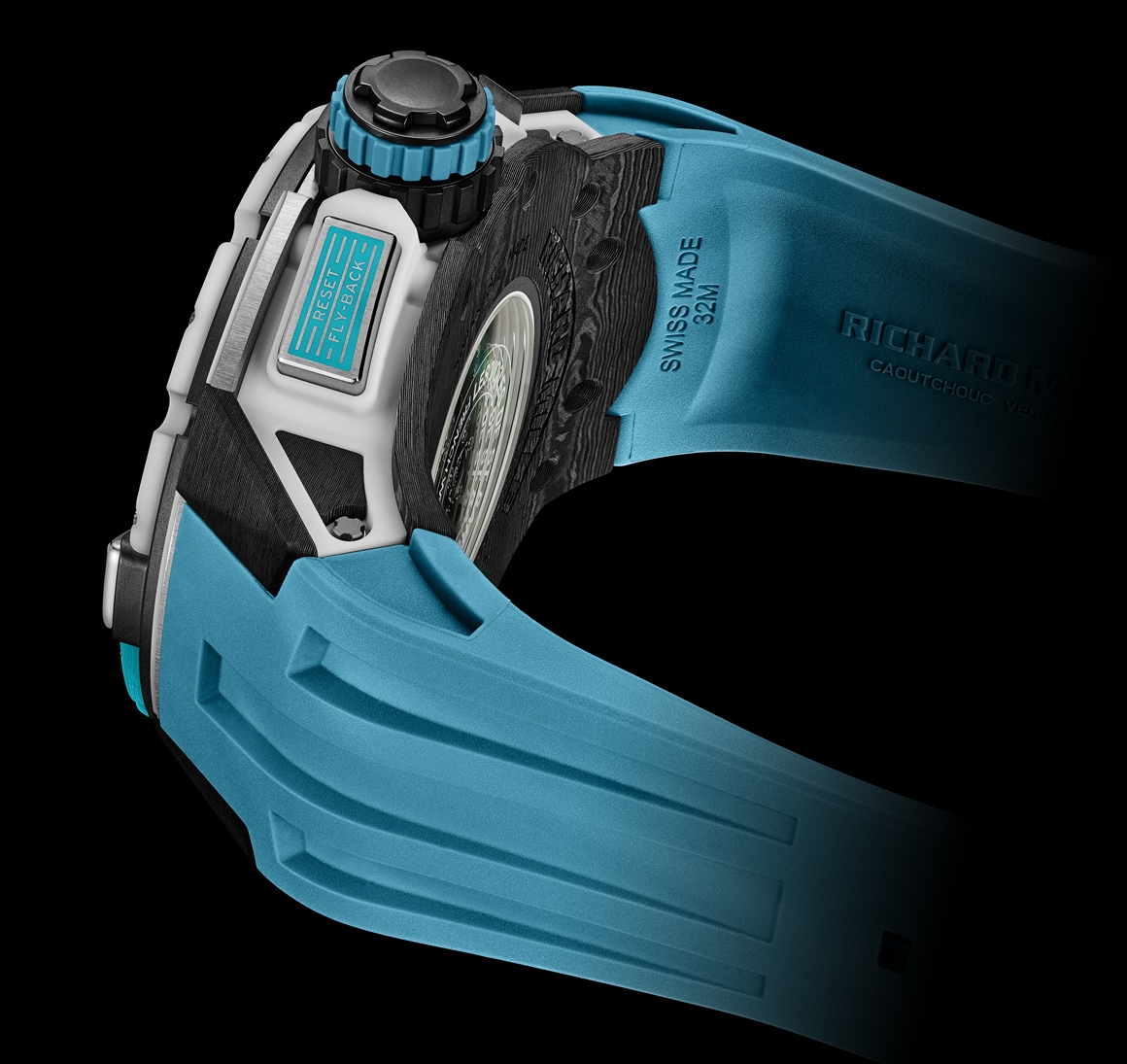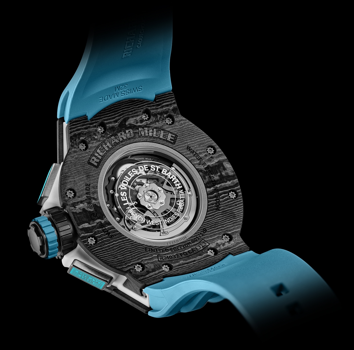 Được Richard Mille sản xuất giới hạn chỉ 120 chiếc, mẫu đồng hồ mới này là sự kết hợp của hai tông màu xanh Caribe và Quartz TPT® trắng. Yêu cầu về khả năng chống nước và độ bền tối ưu đã dẫn đến việc tích hợp hoàn toàn các yếu tố này vào một lớp giữa của bộ vỏ Titanium cấp độ 5. Ngược lại, phần tai đồng hồ và mặt lưng từ Carbon TPT® lại được kết hợp cùng các nút bấm từ Titanium cấp độ 5, dùng để vận hành tính năng chronograph và khóa vòng bezel xoay – một cấu trúc phức tạp mang dấu ấn của Les Voiles de Saint Barth Richard Mille ở mặt sau.