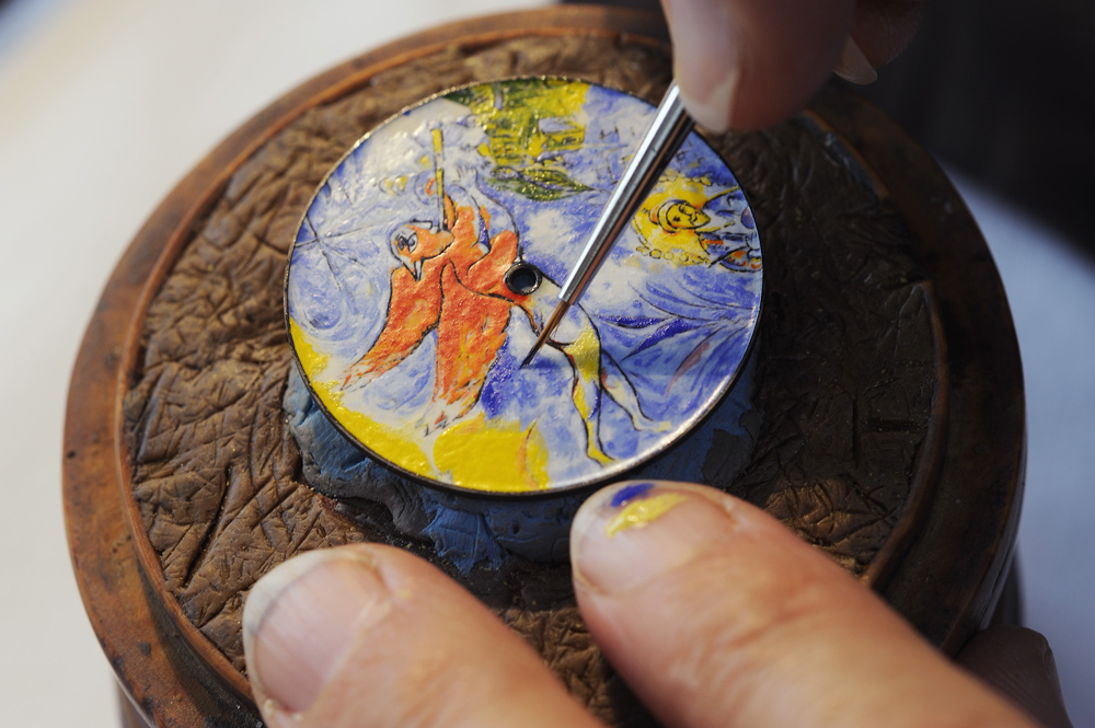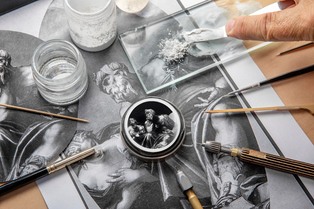 Tùy theo sự lựa chọn và sở thích của khách hàng, nghệ nhân tráng men tại Vacheron Constantin sẽ sử dụng kỹ thuật tráng men thu nhỏ hoặc men Grisaille.