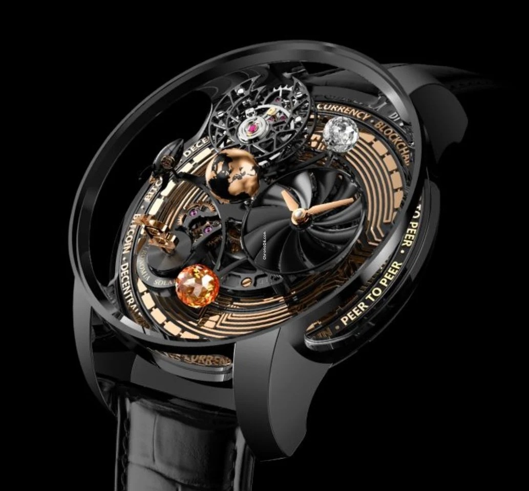 Thông qua việc nạm viên kim cương mang giác cắt Jacob nổi tiếng, viên sapphire cam và biểu tượng Trái đất quay tròn cho Astronomia Solar Bitcoin khoác vỏ titan DLC đen 44mm, Jacob & Co. đã dùng chính tay nghề thủ công xuất sắc để ngợi ca thành công của những nhà đầu tư Bitcoin sành sỏi. Thêm vào đó, mặt số còn trưng bày flying tourbillon cũng như mô hình tên lửa thu nhỏ đang tiếp cận mặt trăng. Tất cả những biểu tượng này diễn giải câu chuyện về tiến trình ra đời của tiền điện tử, từ trừu tượng đến thực tế, từ một đồng tiền ngoại lai cho đến đến vị thế trụ cột hệ thống tài chính. Đảm bảo mọi chuyển động mê hoặc luôn diễn ra đều đặn, phiên bản nâng cấp của bộ máy Astronomia Solar, calibre JCAM19 với phiến đáy giống như con chip siêu nhỏ và được bao quanh bởi các từ khóa mô tả vũ trụ tiền điện tử. Chúng quay ngược chiều kim đồng hồ theo nhịp điệu của một vòng quay tourbillon cứ mỗi 11 phút.